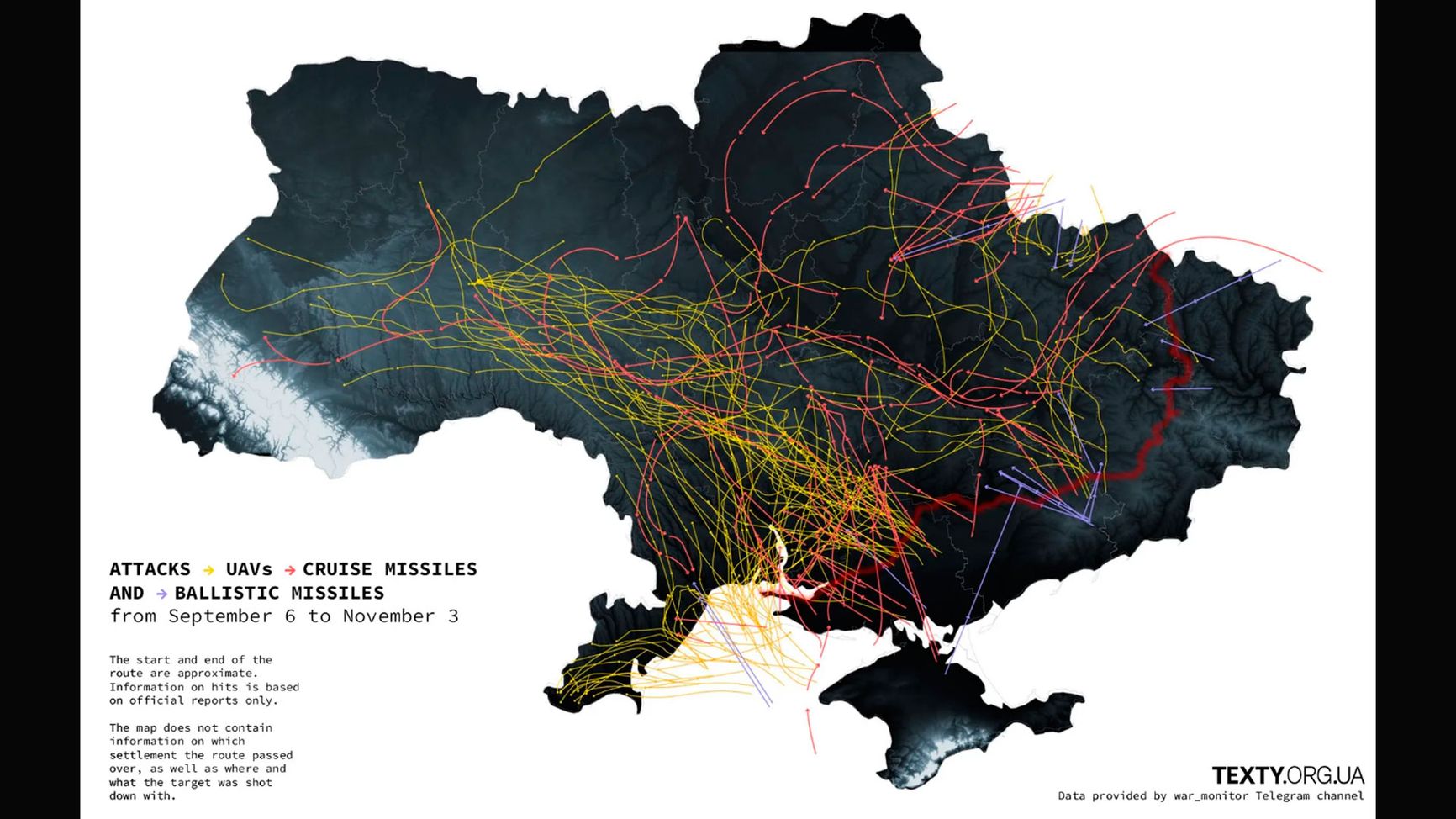 Украинское издание «Тексти» составило приблизительную карту полетных маршрутов российских ракет и БПЛА по мониторинговым сообщениям, которые публикуются во время налетов. Многие из этих атак осуществляются из Крыма. На карте некоторые маршруты начинаются в оккупированной Херсонской области, когда беспилотники впервые попадают в поле зрения украинских средств обнаружения.