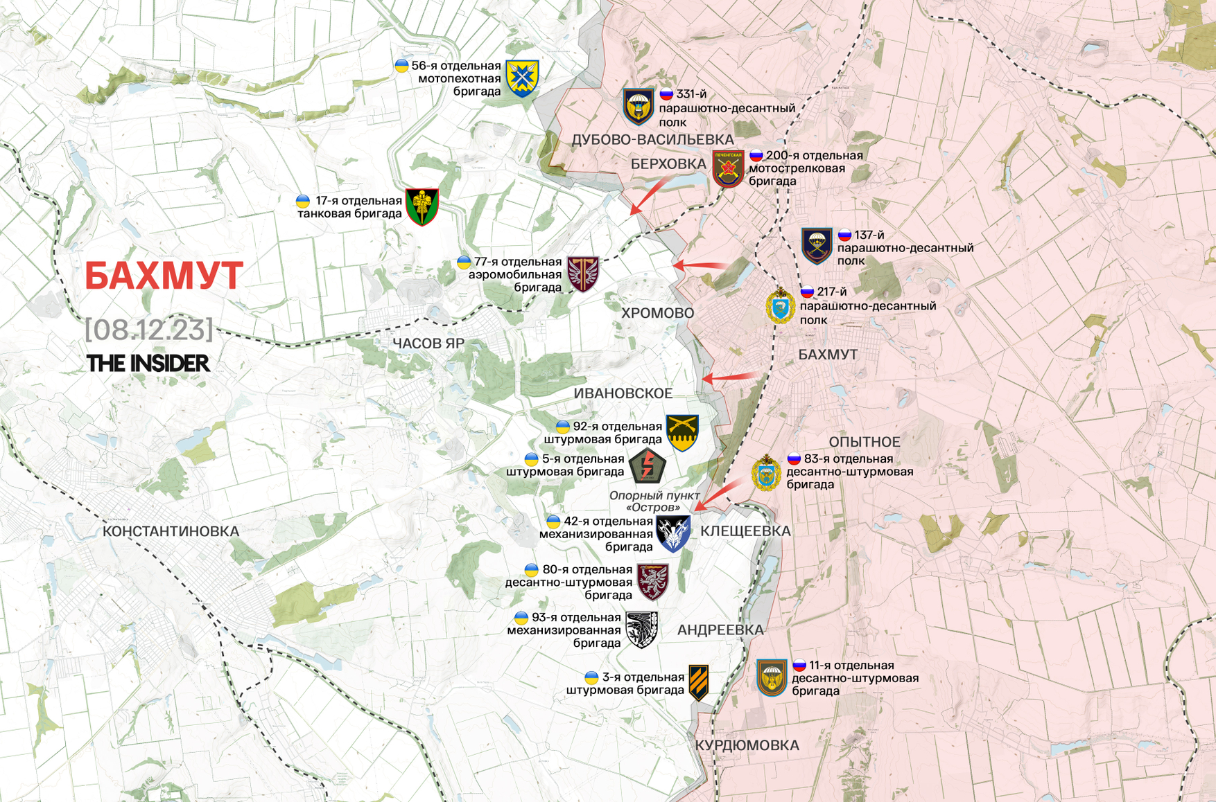 «Военкор» Владимир Романов пишет, что ключевая высота в районе Клещеевки, находящаяся к западу от села (расположенного южнее Бахмута), перешла под контроль ВС РФ. Его коллега Александр Сладков уточняет, что речь идет об опорном пункте «Остров», однако он еще не взят — на эту высоту только «зашли», продолжаются бои.
