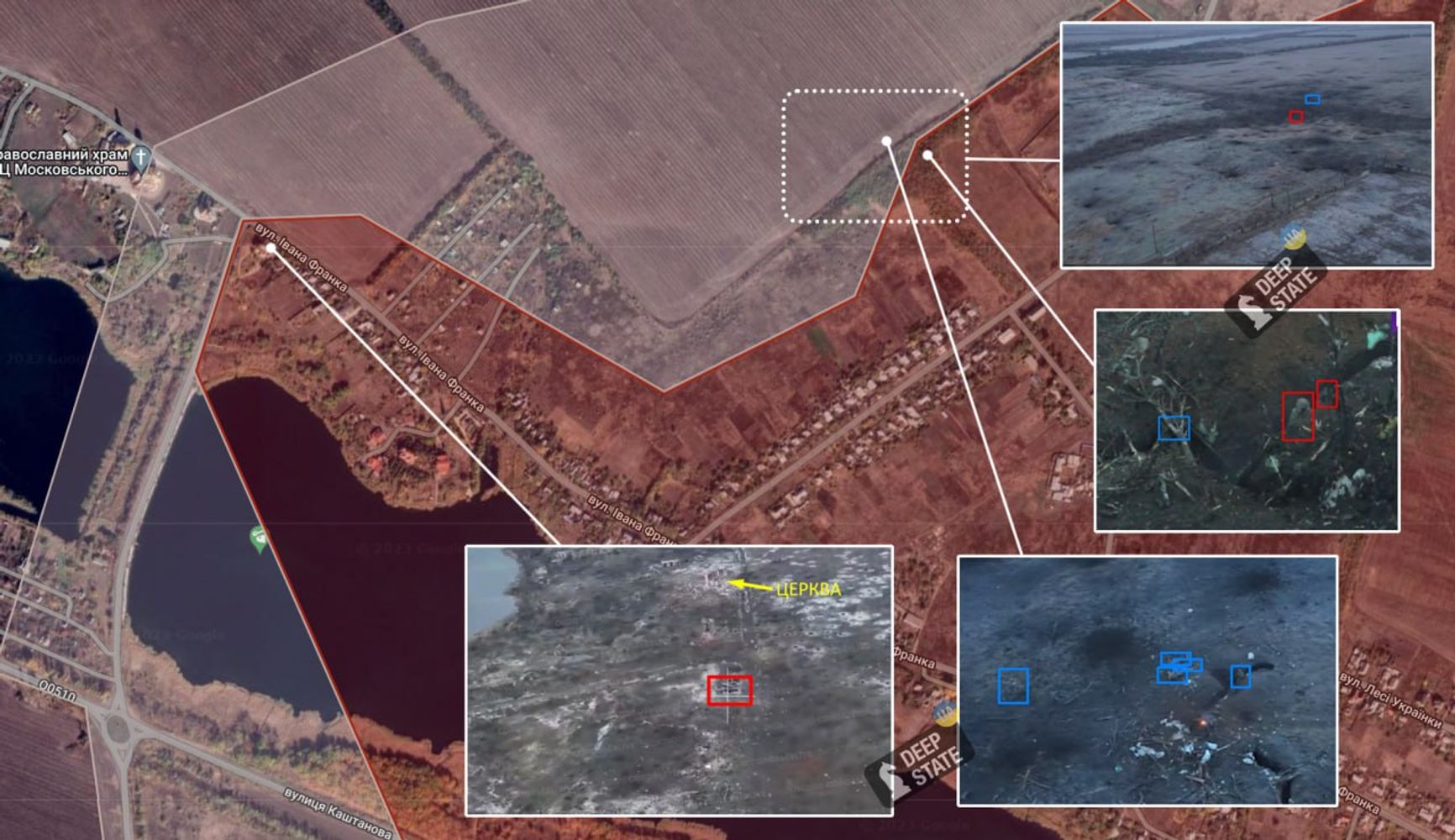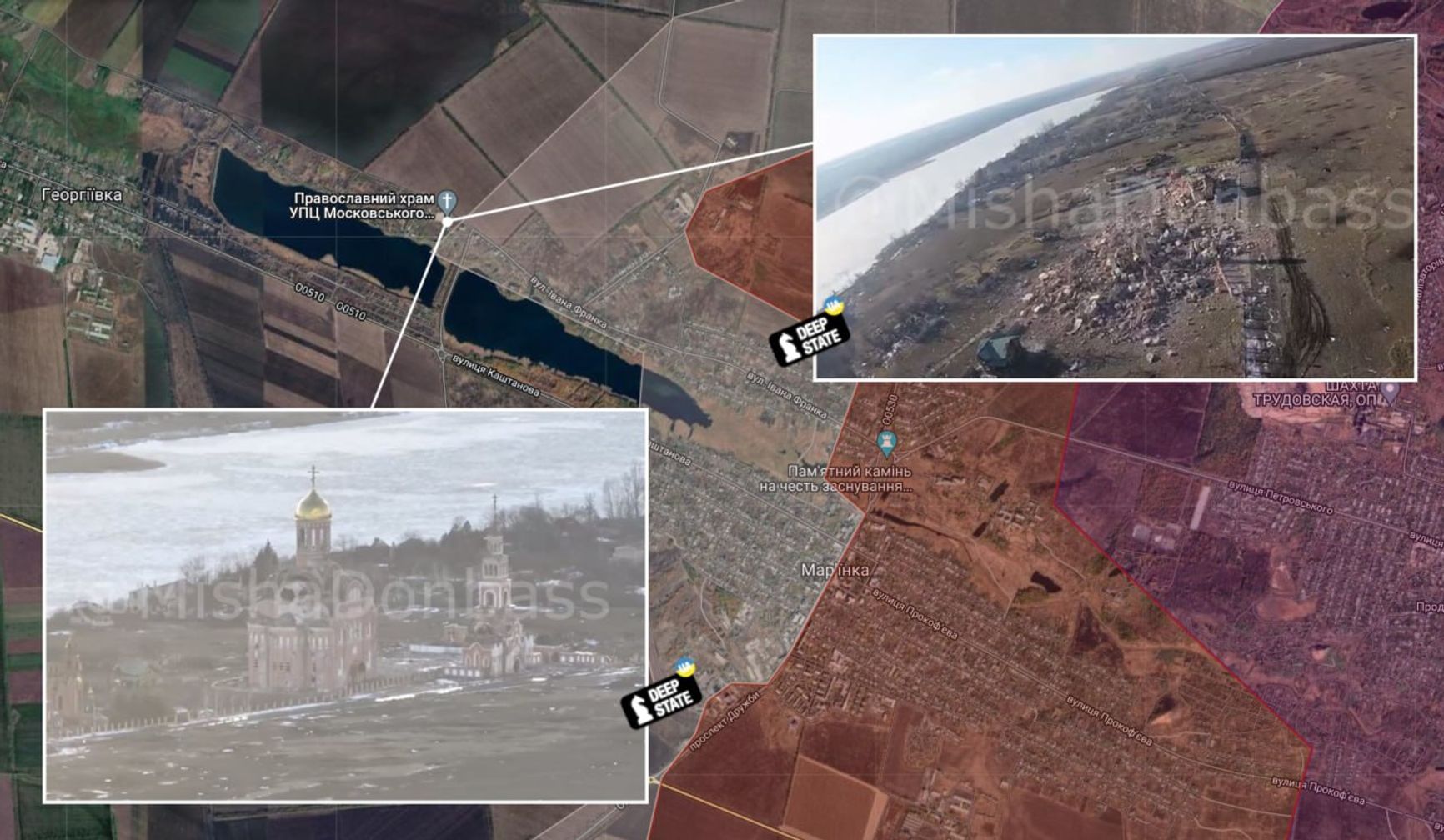 DeepState отмечает, что кадры боев на западных окраинах Марьинки фактически свидетельствуют о потере города. Россияне штурмуют там посадки и подняли флаг напротив разрушенной ранее Георгиевской церкви.