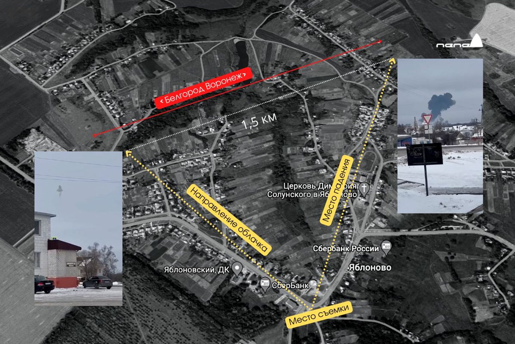 Место падения геолоцировано — это село Яблоново в Корочанском районе, примерно в 50 км от границы с Украиной. Местные жители запечатлели дымный след в небе, который, вероятно, остался после взрыва ЗУР.