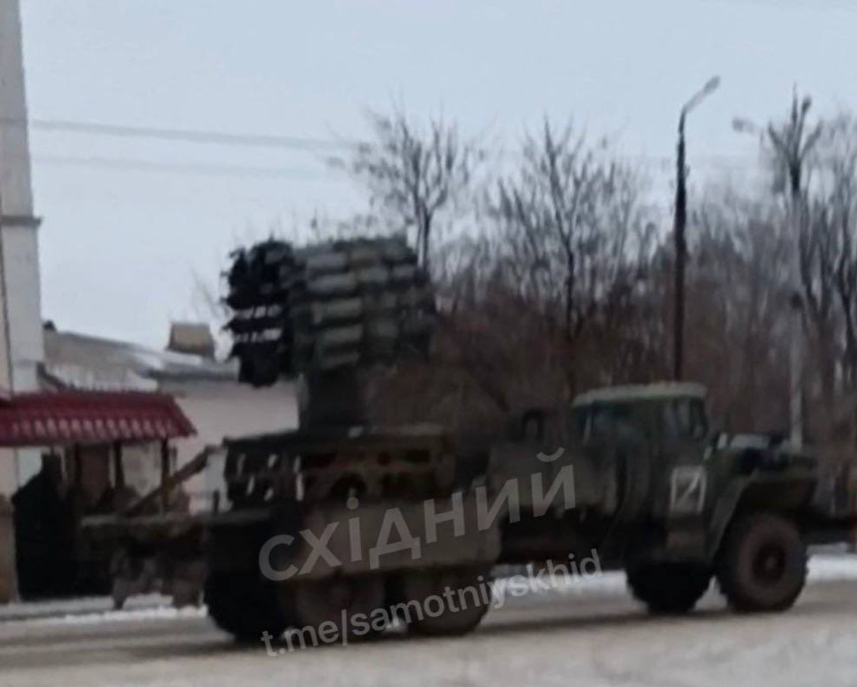 В Алчевске замечена корабельная реактивно-бомбометная установка РБУ-6000 («Смерч-2»), установленная на шасси российского грузовика — вероятно, «Урала».
