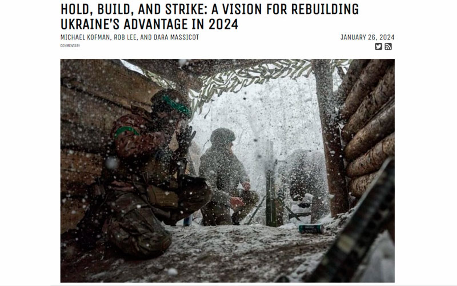 Западные аналитики Майкл Кофман, Роб Ли и Дара Массикот опубликовали пространную статью, посвященную стратегии Украины и стран Запада на 2024 год. Авторы повторяют многократно озвученный тезис, что Украине придется провести наступивший год в обороне из-за преимущества РФ в живой силе и боеприпасах, однако при слаженных и грамотных действиях Киева и западных партнеров можно создать условия для наступления в 2025 году.