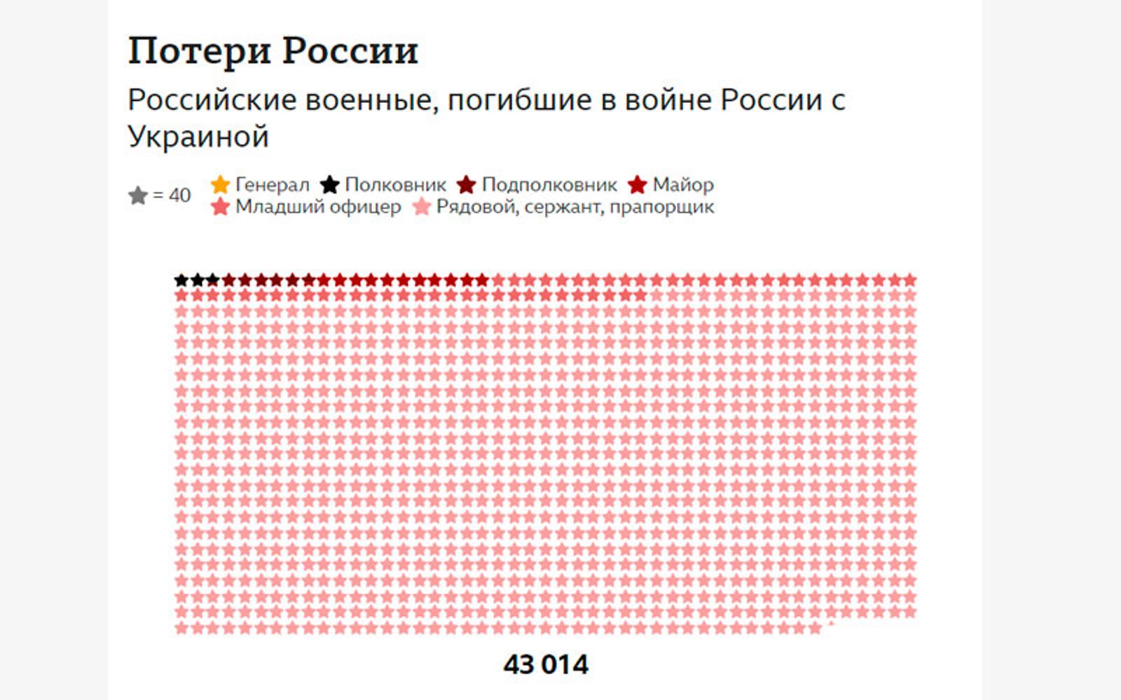 - «Медиазона» и Русская служба Би-Би-Си установили имена свыше 43 тысяч погибших на войне с российской стороны;