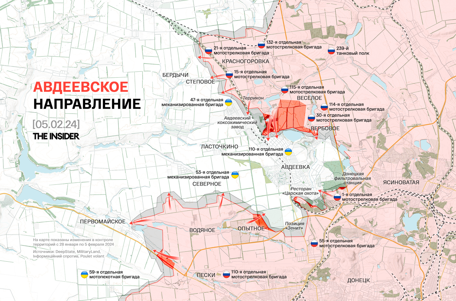 DeepState обозначил на карте существенное продвижение ВС РФ на севере Авдеевки. Украинский журналист Юрий Бутусов пишет, что российским военным удалось закрепиться на одной из улиц, находящейся на северной окраине города. Он напоминает, что две недели назад ВС РФ зашли в город и с юга, и потому для его дальнейшего удержания необходимы свежие резервы и ротация в подразделениях, обороняющих Авдеевку. Кроме того, Бутусов отмечает нехватку боеприпасов и то, что нижестоящие командиры не хотят передавать плохие новости генералитету, таким образом вводя высшее командование в заблуждение.