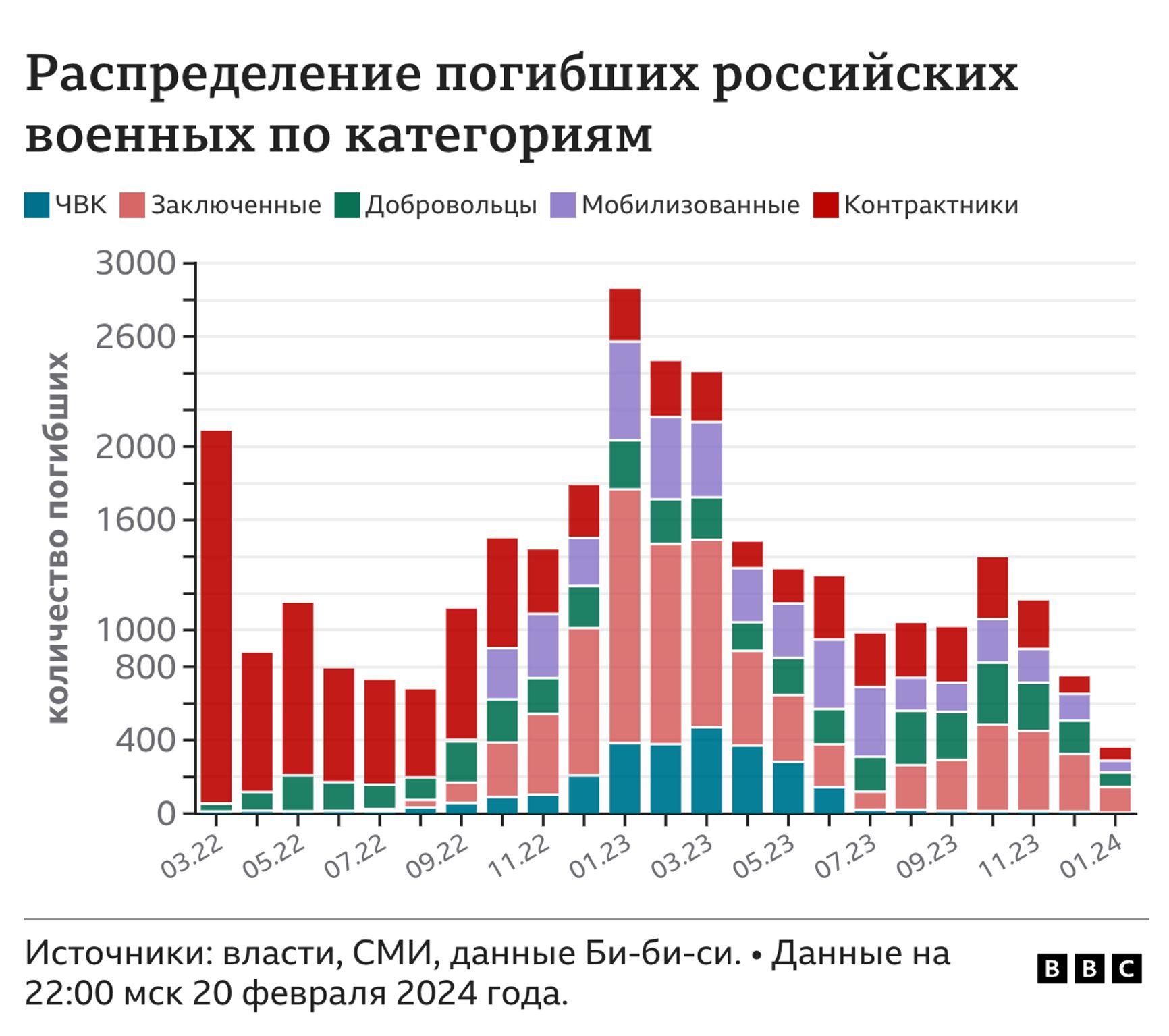 Русская служба Би-би-си совместно с изданием «Медиазона» и командой волонтеров публикует обновленные подсчеты потерь в войне с российской стороны на основе сообщений (некрологов) в открытых источниках. Всего установлены имена 45 123 человек, из них по меньшей мере 6614 человек погибли в период с октября 2023 года по февраль 2024 года, то есть во время операции по захвату Авдеевки.