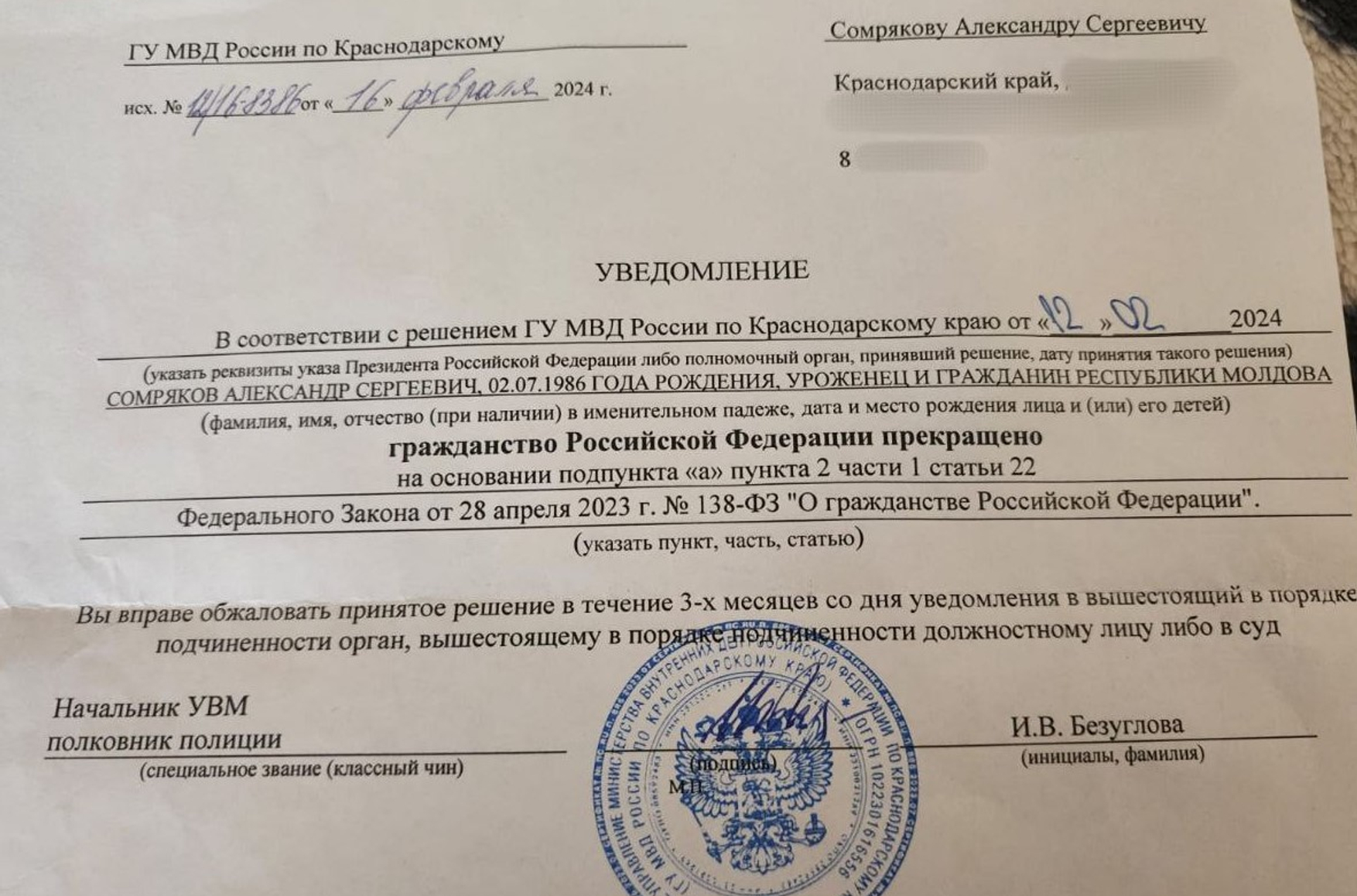 Как сообщил в письме Telegram-каналу сам Сомряков, 16 февраля ему пришло уведомление из МВД о прекращении его российского гражданства за «совершение преступления».