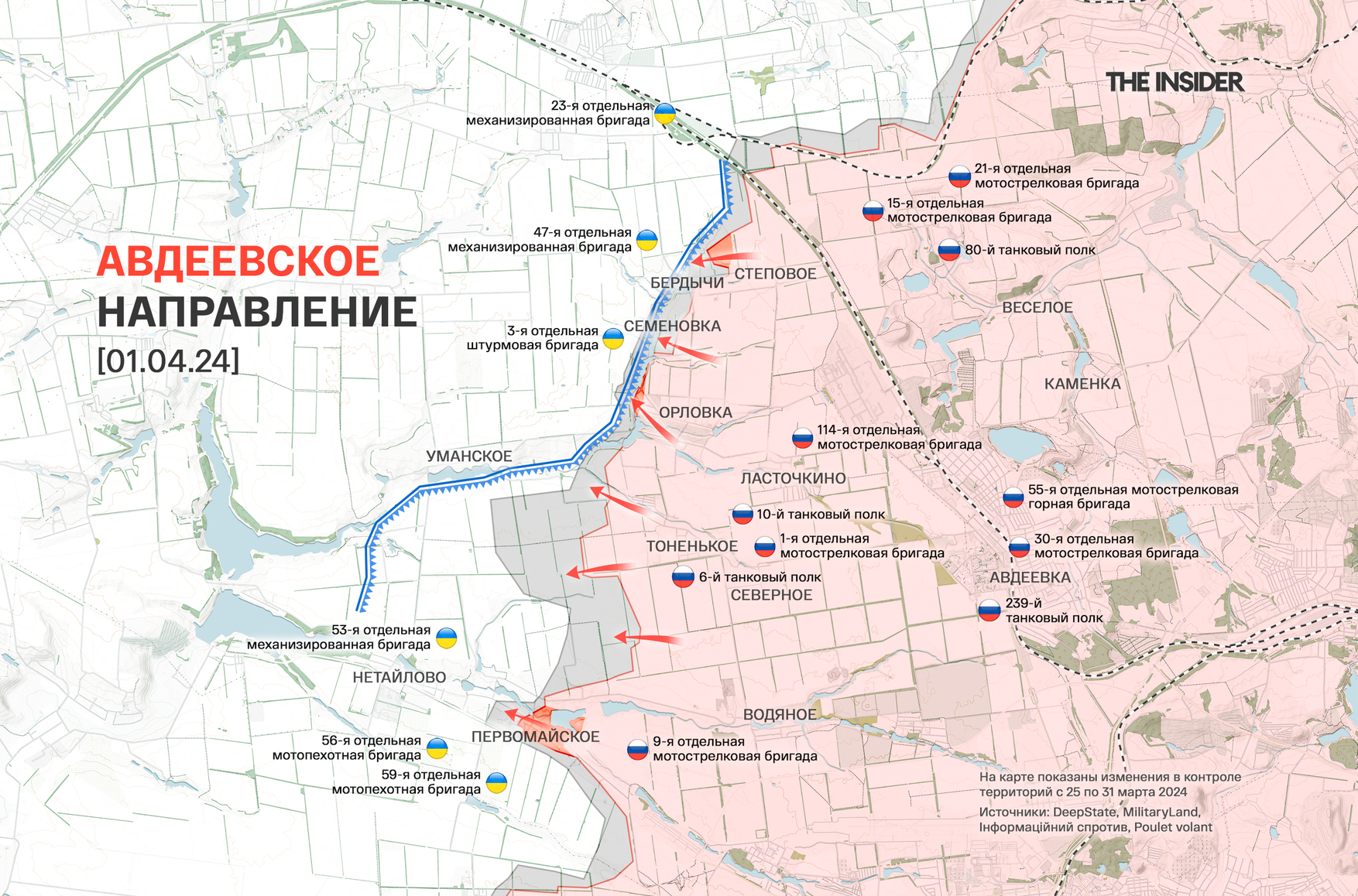 Украинский военный под ником Kriegsforscher пишет о неудачном наступлении 30 марта механизированной колонны противника под Тоненьким западнее Авдеевки по направлению на Уманское (геолокация). По его данным, в колонне насчитывалось 36 танков и 12 БМП, из них 12 танков и 8 БМП были подбиты. В соцсетях 25-й отдельной воздушно-десантной бригады ВСУ выложено видео с одним из эпизодов отражения этой атаки.