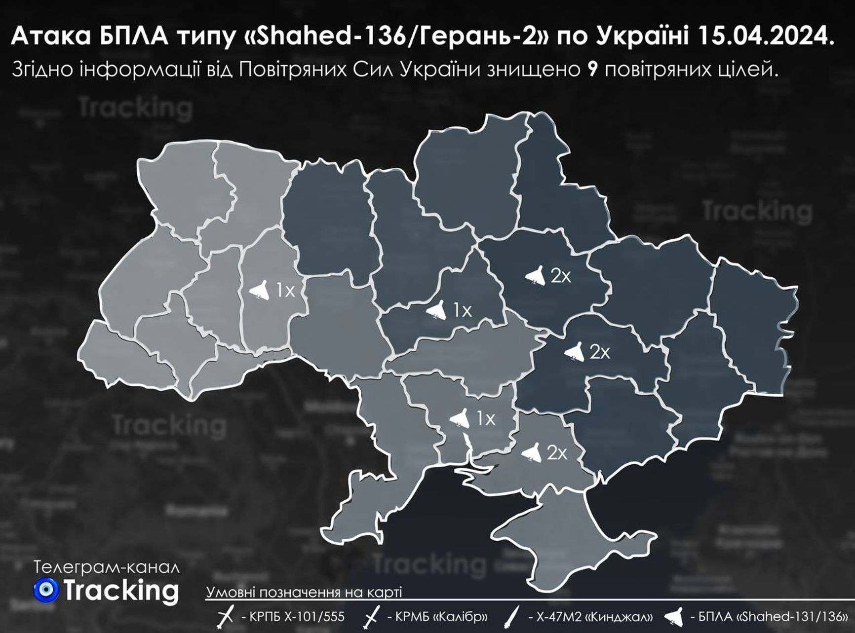 В ночь на 16 апреля по территории Украины были выпущены девять беспилотников типа «Шахед», сообщает командование Воздушных сил ВСУ. Все дроны были сбиты над территорией Херсонской, Николаевской, Хмельницкой, Полтавской, Черкасской и Днепропетровской областей.