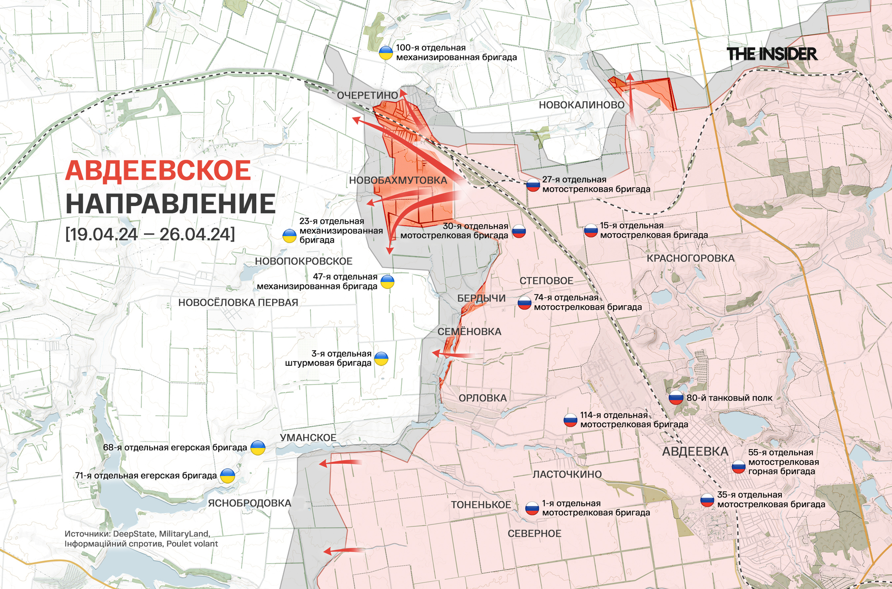 Согласно информации DeepState, в авдеевском операционном районе ВС РФ удалось продвинуться в районе Очеретино, в Соловьёво и южнее Новобахмутовки, таким образом, российское наступление со стороны образовавшегося «выступа» разворачивается в сторону линии обороны УманскоеСемёновкаБердычи, а не вглубь по направлению на Покровск, как можно было бы ожидать в случае настоящего прорыва на этом участке. Присутствие российских военных в Соловьёво подтверждается видеороликом с «флаговтыком» в центре этого населенного пункта.
