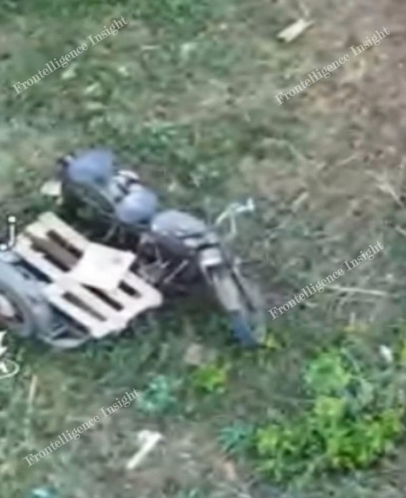 Tatarigami_UA поделился кадром с беспилотника, запечатлевшим российский «штурмовой мотоцикл», на котором вместо коляски закреплен деревянный поддон для перевозки десанта.