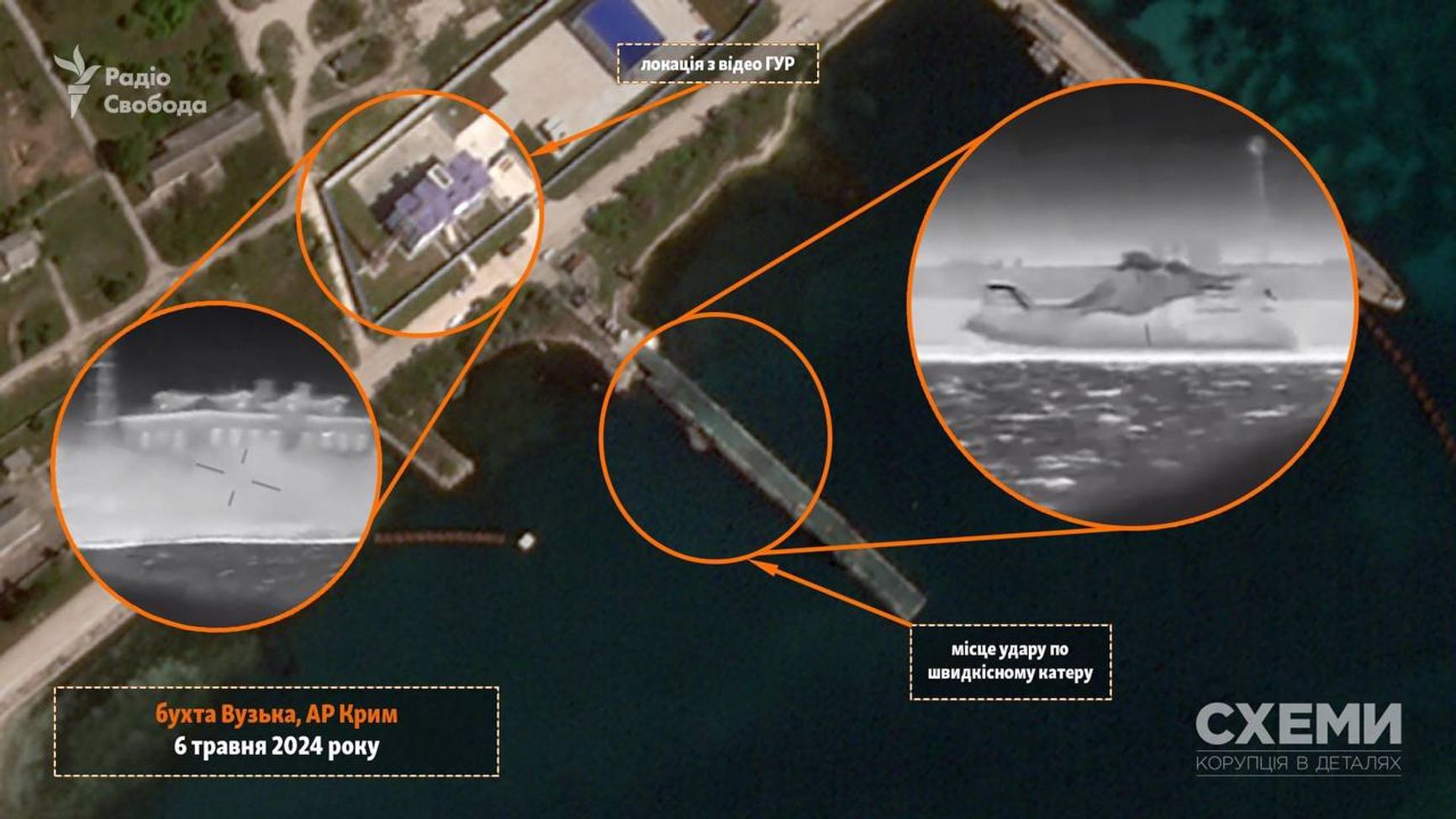 В ГУР также заявляют об уничтожении российского быстроходного катера серии «Мангуст» с помощью БЭК Magura V5 и показывают кадр попадания в него. На спутниковом снимке виден поврежденный пирс, у которого катер был пришвартован.