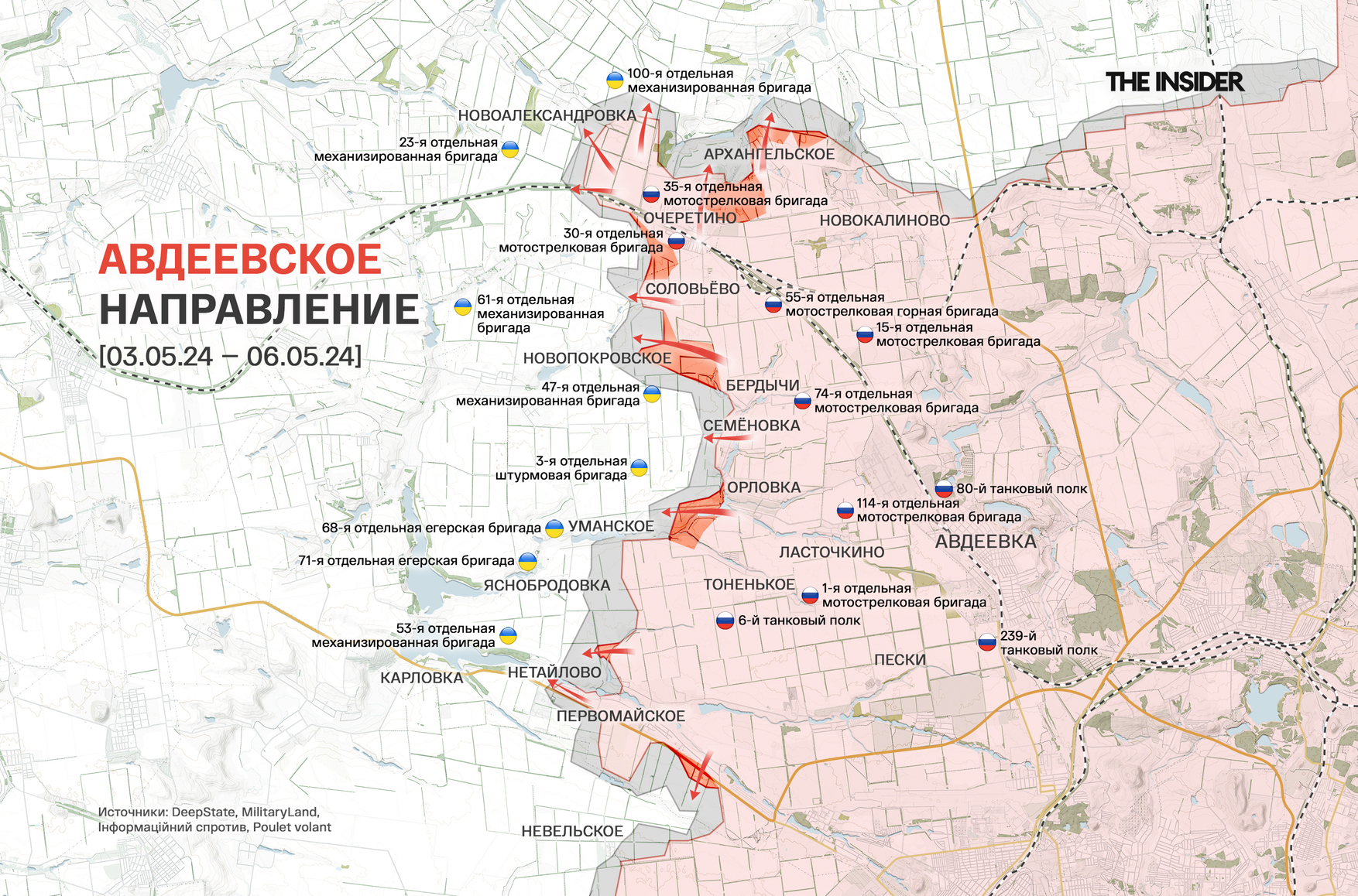 DeepState признает потерю украинскими войсками Архангельского и Очеретино к северу от авдеевского операционного района, а также Котляровки и Кисловки юго-восточнее Купянска. Помимо этого, аналитики проекта сообщают о продвижении ВС РФ около Новопокровского, Уманского, Первомайского, Нетайлово и в Красногоровке. Минобороны РФ также отчитывается о полном захвате Очеретино.
