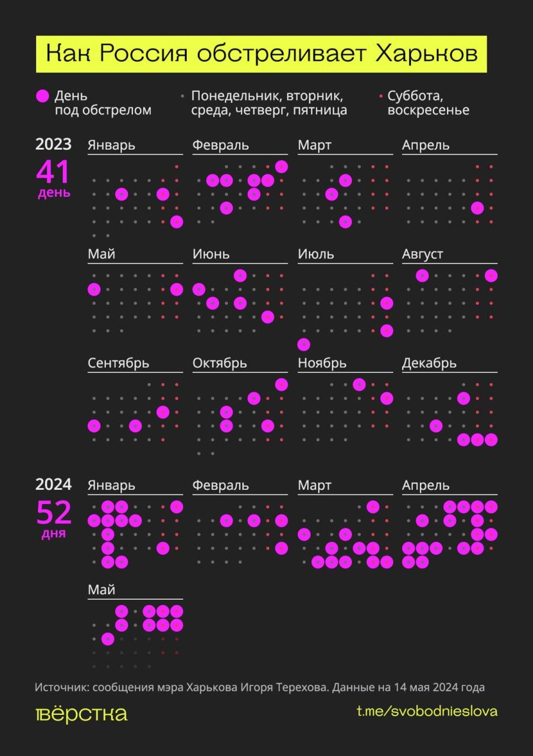 Наиболее интенсивный обмен ударами, в ходе которых страдали мирные жители, имел место между Харьковской (1, 2, 3, 4, 5) и Белгородской (1, 2, 3) областями. По подсчетам «Вёрстки», город Харьков в период с января по май 2024 года чаще подвергался обстрелам, чем за весь 2023 год.