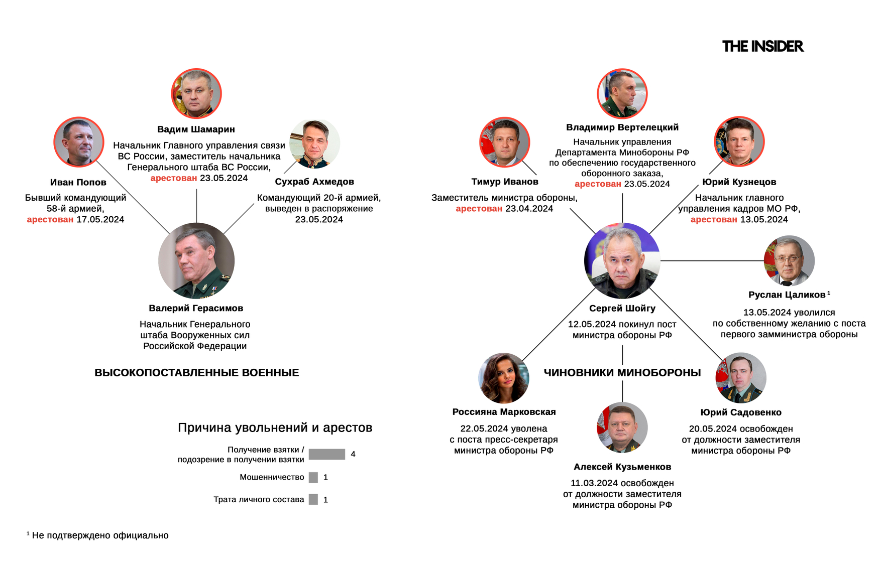 - 17 мая — бывший командующий 58-й армии, генерал-майор Иван Попов, мошенничество. По версии следствия, генерал причастен к хищению более 1,7 тысячи тонн изделий металлопроката стоимостью 130 млн рублей в Запорожской области в 2023 году, закупленных администрацией. Материалы должны были использоваться для создания инженерных оборонительных сооружений на линии боевого соприкосновения.