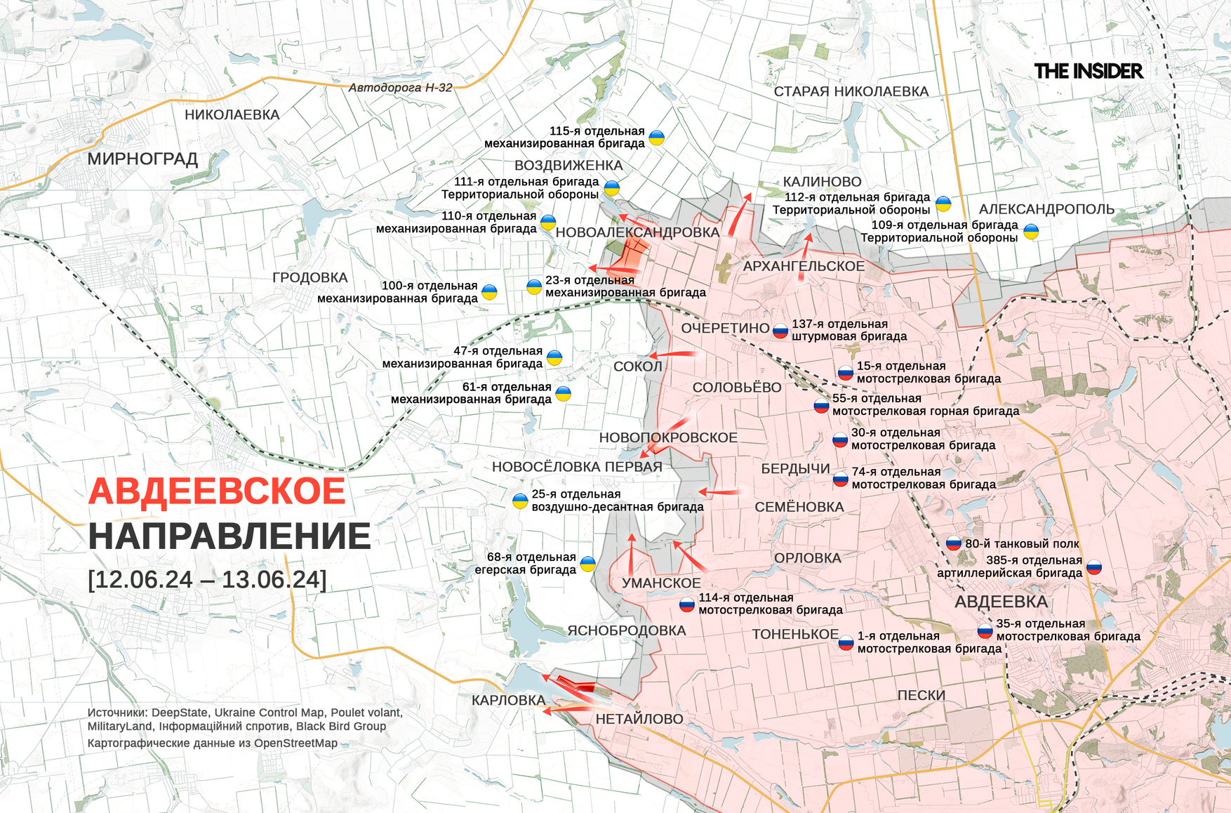 DeepState также отмечает продвижение российских войск в населенных пунктах Новоалександровка и Новопокровское на северном фланге и в Карловке на южном фланге полосы наступления в авдеевском операционном районе, то есть на всем протяжении своеобразной «дуги» северо-западнее Авдеевки.