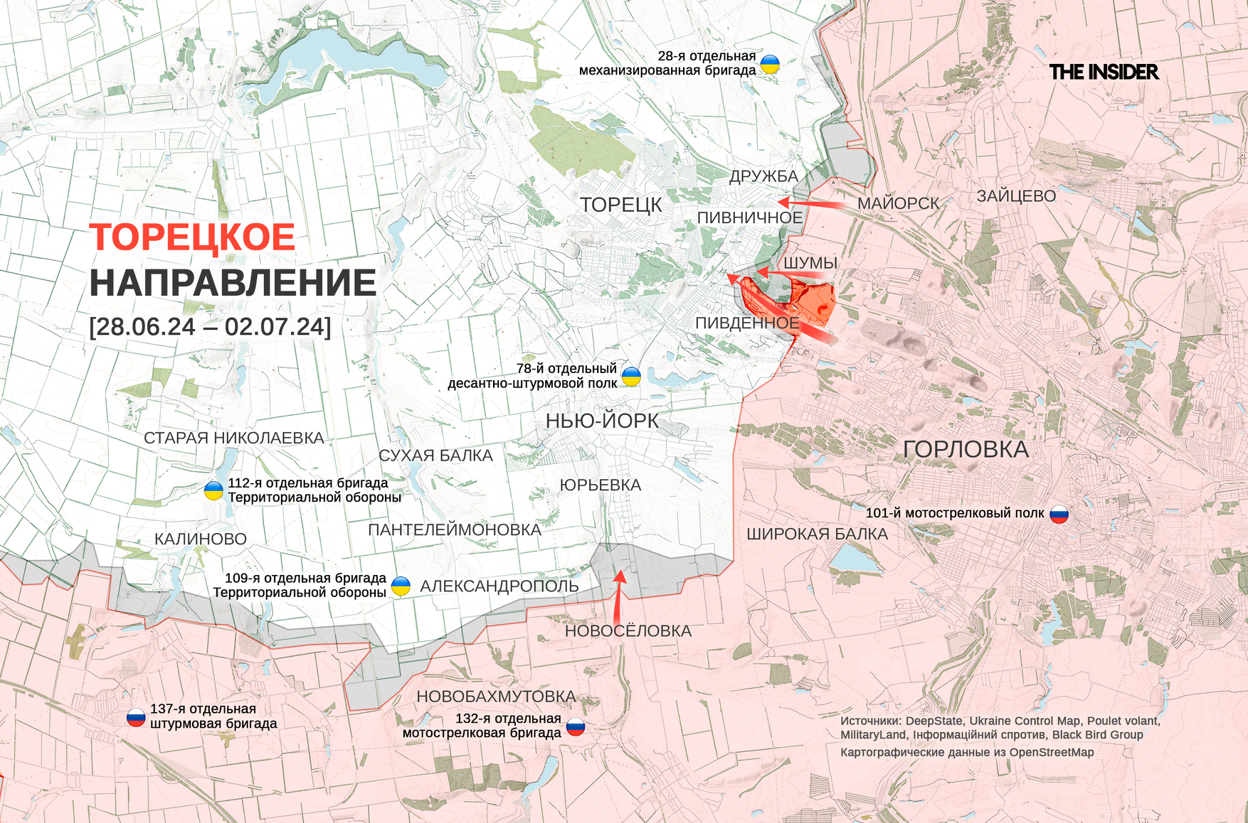 Украинский военный обозреватель Константин Машовец дает оценку положению на торецком направлении (накануне мы писали о российском «прорыве» там, предположительно, при помощи подземного туннеля). Он считает ближайшей целью командования противника выход к населенному пункту Нью-Йорк (в 1951–2021 годах — Новгородское) и объясняет неочевидные действия по наступлению на Торецк (до 2016 года — Дзержинск) неудачей с операцией по захвату Часова Яра и тем самым отсутствием условий для окружения всего торецкого укрепрайона.