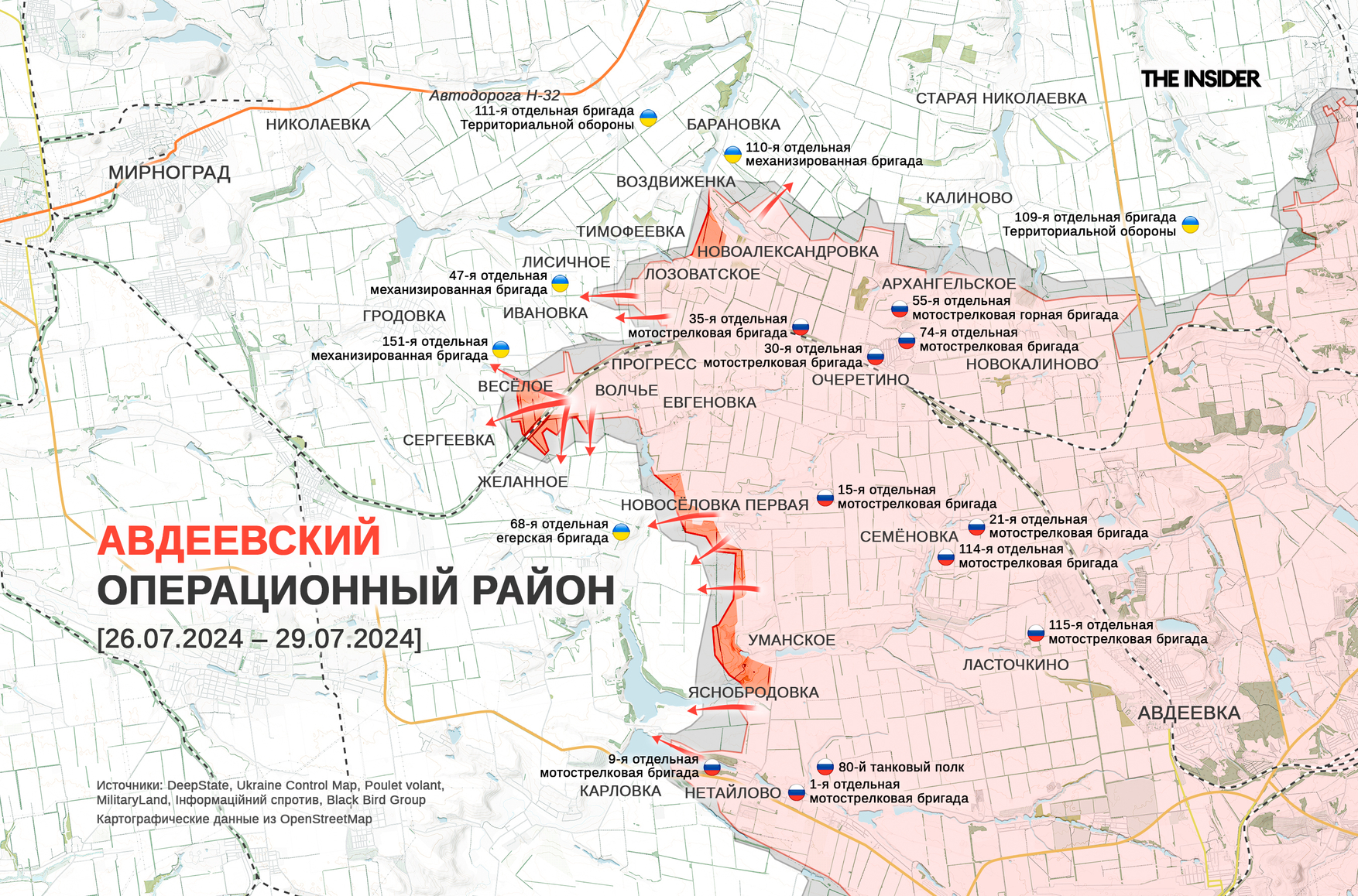 Сообщения DeepState (1, 2, 3) и Минобороны РФ (1, 2, 3) свидетельствуют о продвижении российских войск за рекой Волчья на северном фланге авдеевского операционного района — рядом с сёлами Волчьим, Весёлым и Прогрессом — в сторону Желанного вдоль железнодорожной ветки, расположенной на возвышенности. К югу от образовавшегося выступа ВС РФ, судя по всему, полностью заняли Новосёловку Первую (появилось видео с «флаговтыком» на западной окраине этого населенного пункта), а также увеличили зону контроля рядом с Яснобродовкой.