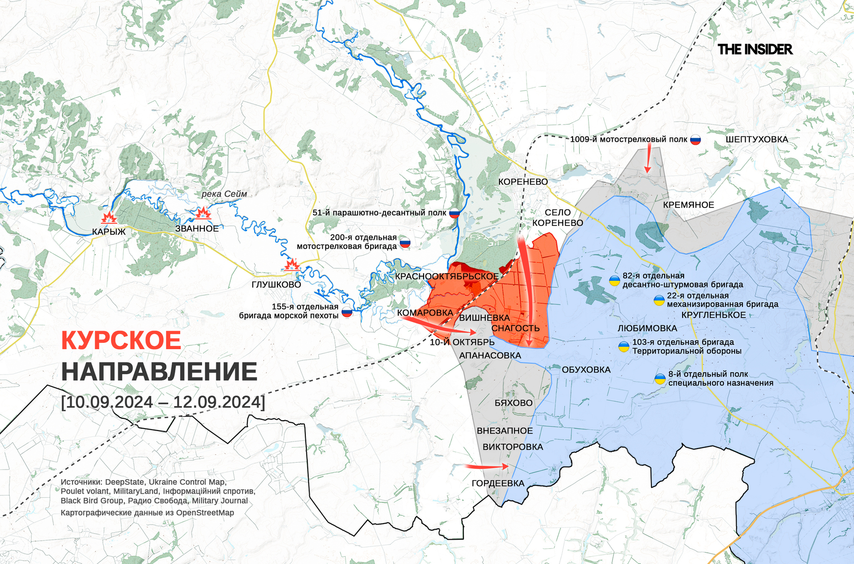 Между тем Минобороны РФ отчитывается об освобождении десяти населенных пунктов в Курской области: Апанасовка, Бяхово, Вишнёвка, Викторовка, Внезапное, Гордеевка, Краснооктябрьское, Обуховка, Снагость и 10-й Октябрь.