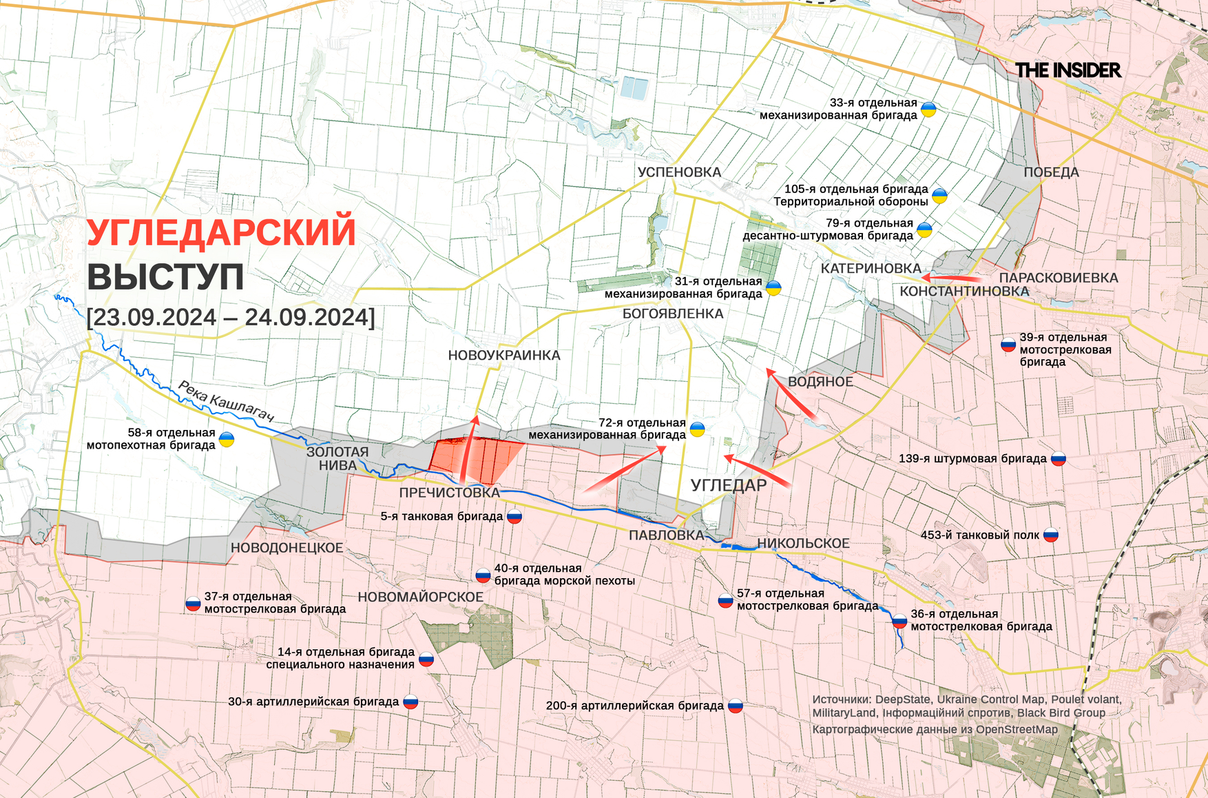 «Друзья, не бегите вперёд ̶п̶а̶р̶о̶в̶о̶з̶а̶ штурмовиков и не спешите расчехлять свои виртуальные красные кисти для закраса улиц Угледара. Вы сильно опережаете события. Непосредственно с мест ваши смелые закрасы опровергаются. Не создавайте фон для очаровывания, чтобы не было потом повода разочаровываться <авторские орфография и пунктуация сохранены — The Insider>».
