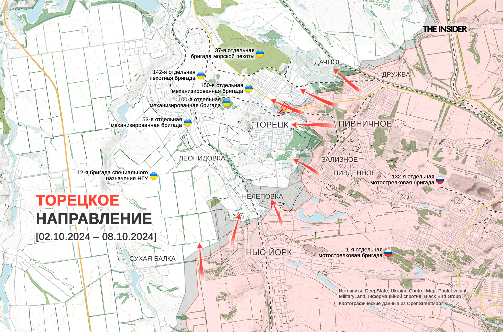 ВСУ признали заход противника на восточную окраину Торецка (до 2016 года — Дзержинск). По словам представительницы ОТГ «Луганск» Анастасии Бобовниковой, ситуация в городе «нестабильная», а бои ведутся «буквально за каждый подъезд». Как пишет украинский военнослужащий Станислав Бунятов, ВС РФ стараются атаковать через центр в направлении северо-восточной части города, не обращая внимания на окружающую агломерацию.