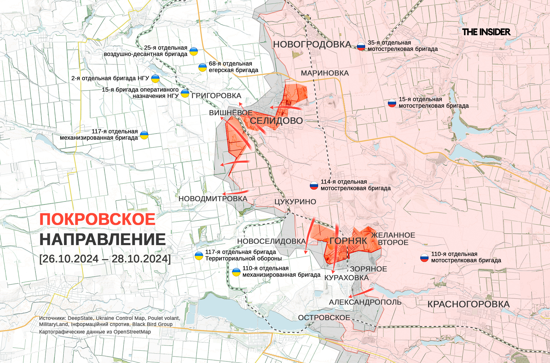 • 28 октября — о захвате ВС РФ Горняка на южном фланге покровского направления и продвижении россиян в Селидове, Богоявленке и Новоукраинке, а также около Шахтерского и Новоалексеевки вблизи Селидова