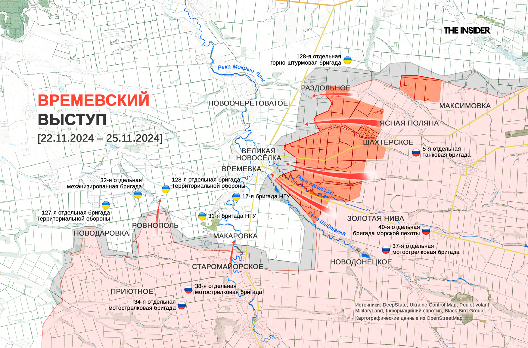 • 22 ноября — о продвижении ВС РФ около Великой Новосёлки и северо-восточнее рядом с Раздольным на Времевском выступе, а также около Максимовки к югу от линии обороны вдоль реки Сухие Ялы, Пустынки на покровском направлении и в Торецке (до 2016 года — Дзержинск);