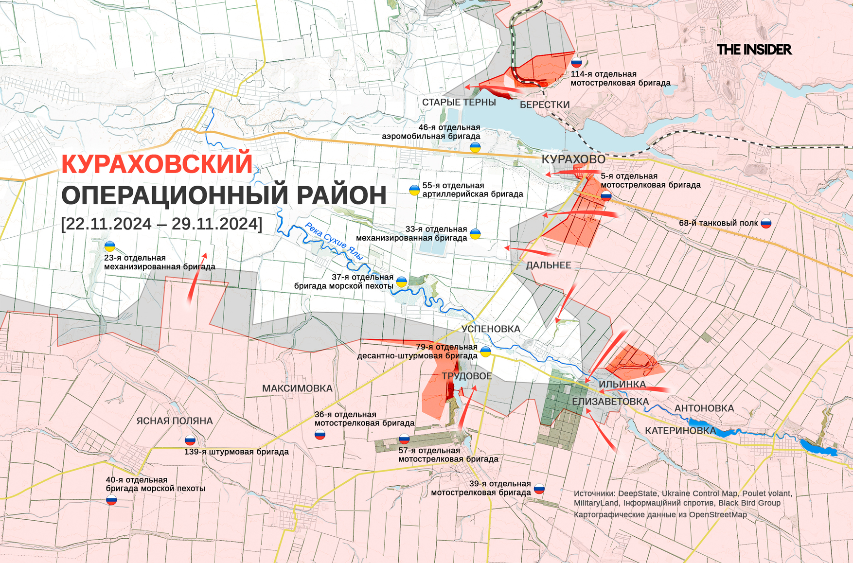 DeepState также признает продвижение российских войск вдоль берега Кураховского водохранилища и в самом городе до центральной части с многоэтажной застройкой. Прорыв со стороны Старых Терн значительно усложнит оборону этого района и перережет логистику, предупреждают аналитики проекта.