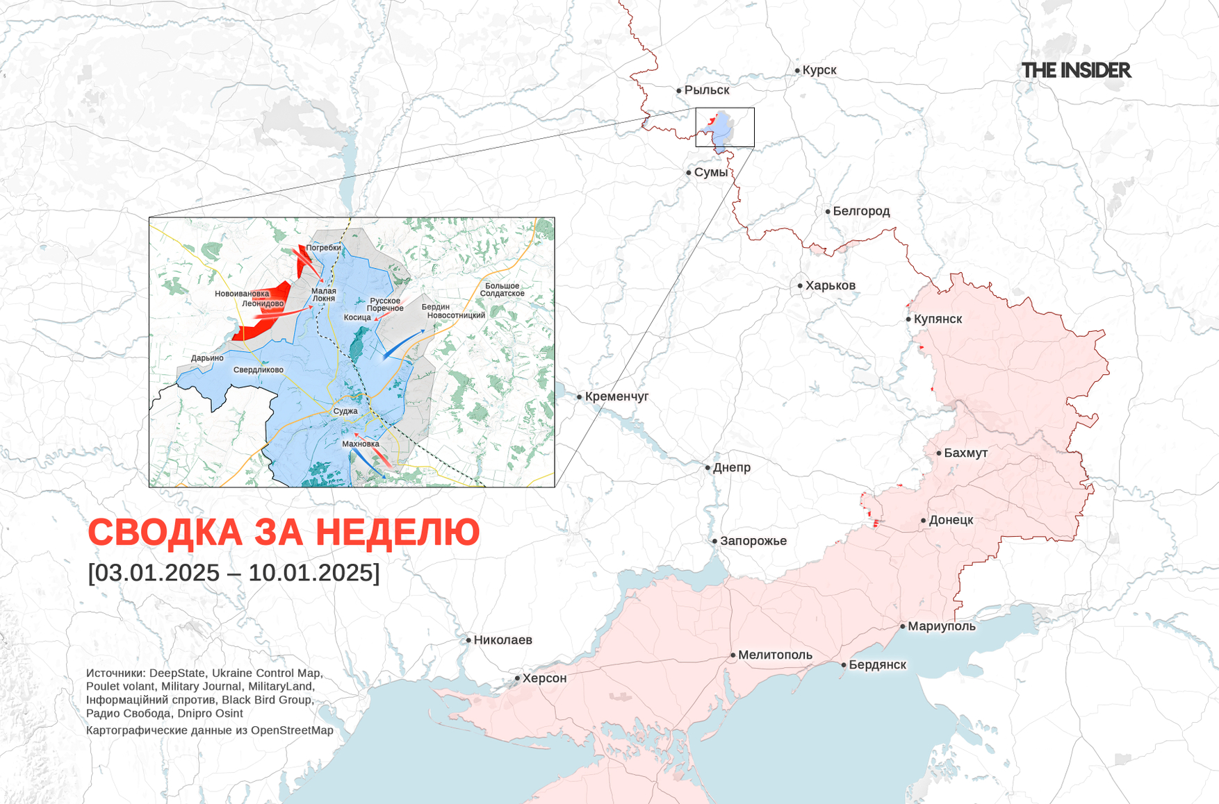 Последняя неделя в Курской области ознаменовалась наступлениями обеих сторон. 5 января 2025 года механизированные колонны ВСУ двинулись в направлении населенных пунктов Бердин и Новосотницкий в сторону райцентра Большое Солдатское. Судя по геолокации, украинским военным удалось войти в Бердин по крайней мере на некоторое время. ВСУ понесли потери в технике и личном составе, в том числе пленными (1, 2, 3), а ситуация на этом участке остается неясной — по крайней мере, российские пропагандисты избегают съемок в той части Бердина, которая обозначена на карте DeepState как «серая зона».