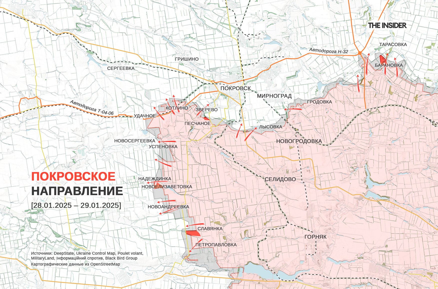 Аналитики DeepState сообщают о продвижении ВС РФ около Песчаного в окрестностях Покровска (до 2016 года — Красноармейск), Надеждинки на западном фланге и Барановки — на восточном фланге выступа под агломерацией Покровска и Мирнограда. Минобороны РФ отчиталось о захвате Новоелизаветовки, расположенной перед Надеждинкой, опубликовав видео с боями и «флаговтыком» в населенном пункте.
