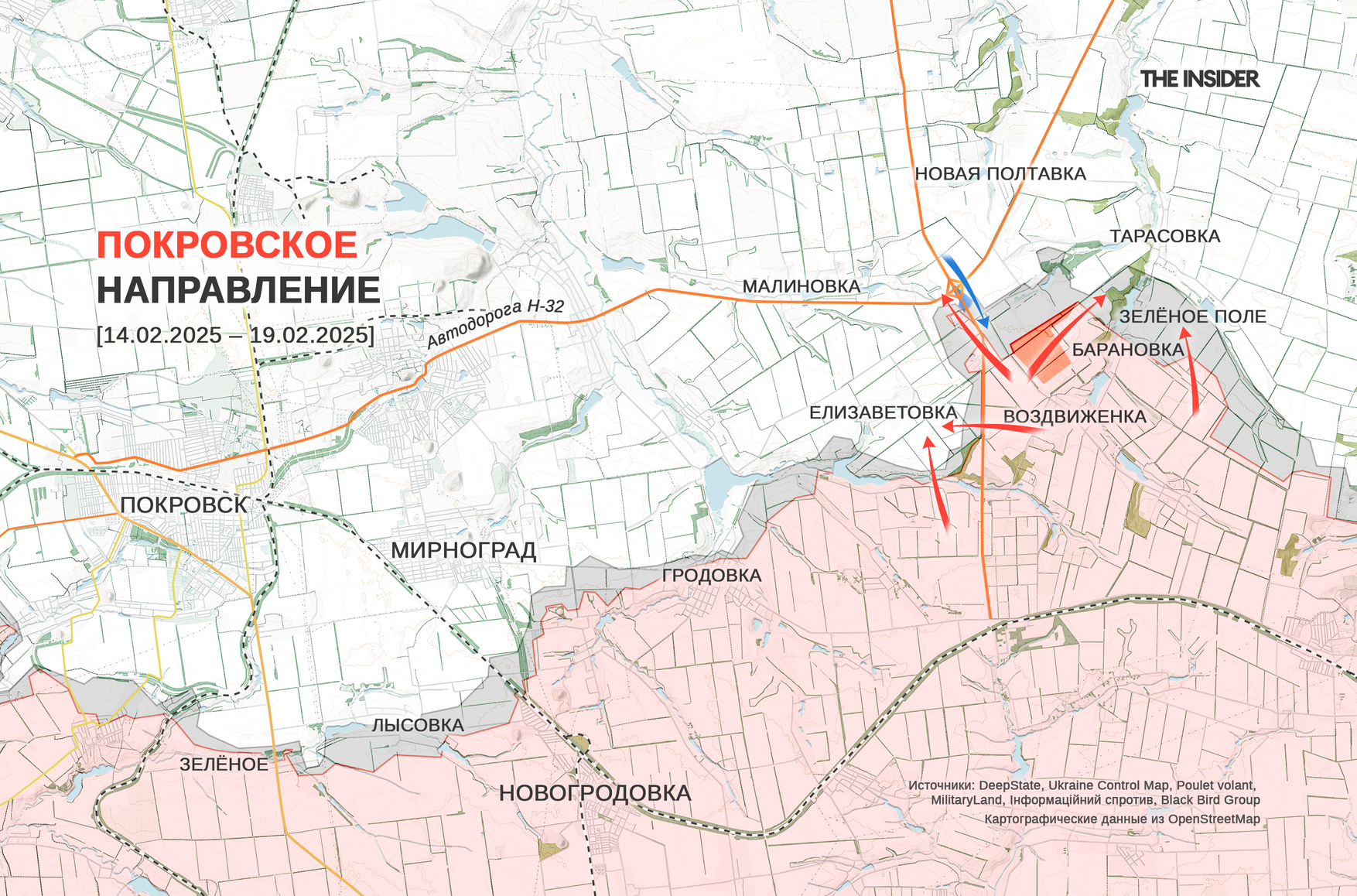 DeepState сообщает, что украинские войска отбросили противника от развязки на трассе в сторону Константиновки восточнее Малиновки, в то же время ВС РФ продвинулись около Барановки на восточном фланге и в сторону Песчаного на западном фланге сформированного под агломерацией Покровска (до 2016 года — Красноармейск) и Мирнограда выступа.