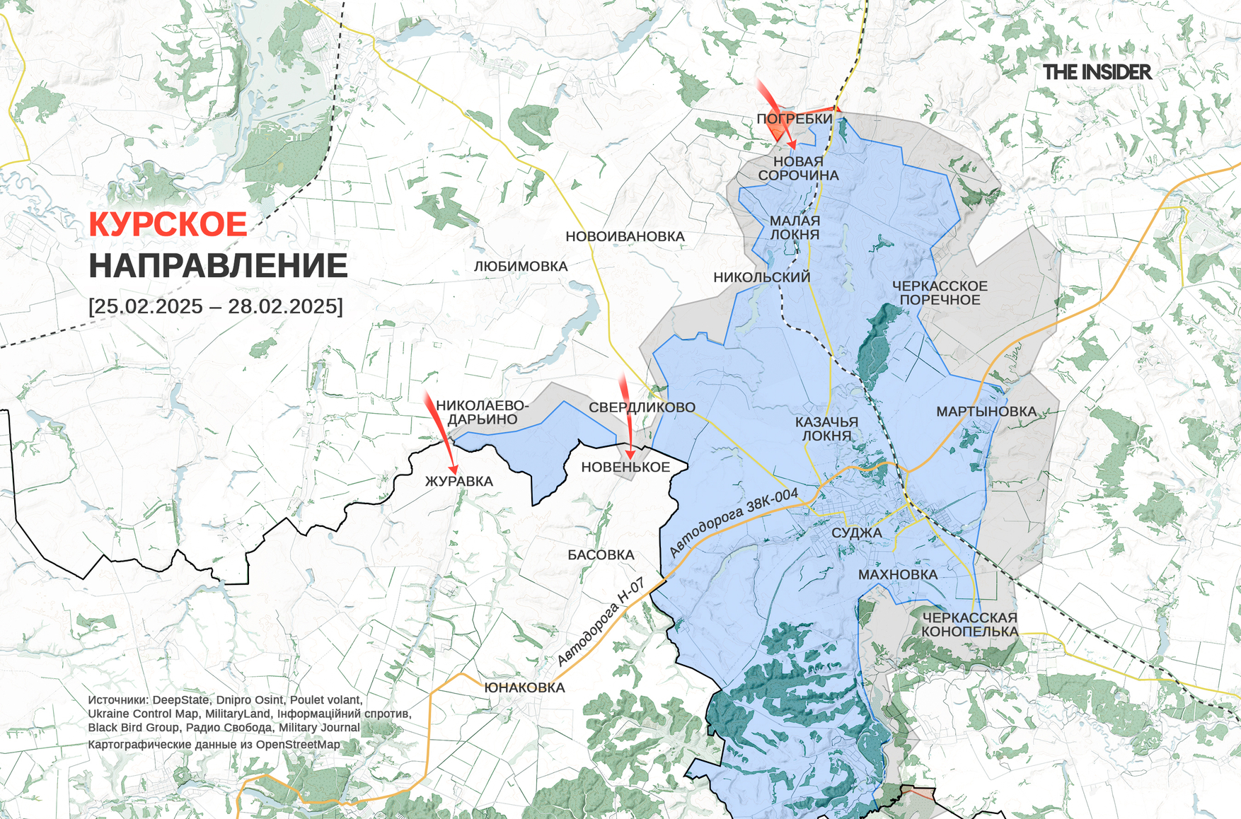 Аналитики DeepState сообщают о продвижении российских войск в курском Свердликово. На карте проекта 2,8 км² территории Сумской области, включая село Новенькое, отнесено к «серой зоне». В Z-канале «Военный Осведомитель» отмечают, что о значительных успехах здесь пока говорить не приходится, однако это вклинение, вероятно, осуществляемое малыми пехотными группами, позволило затруднить снабжение группировки ВСУ в Курской области.