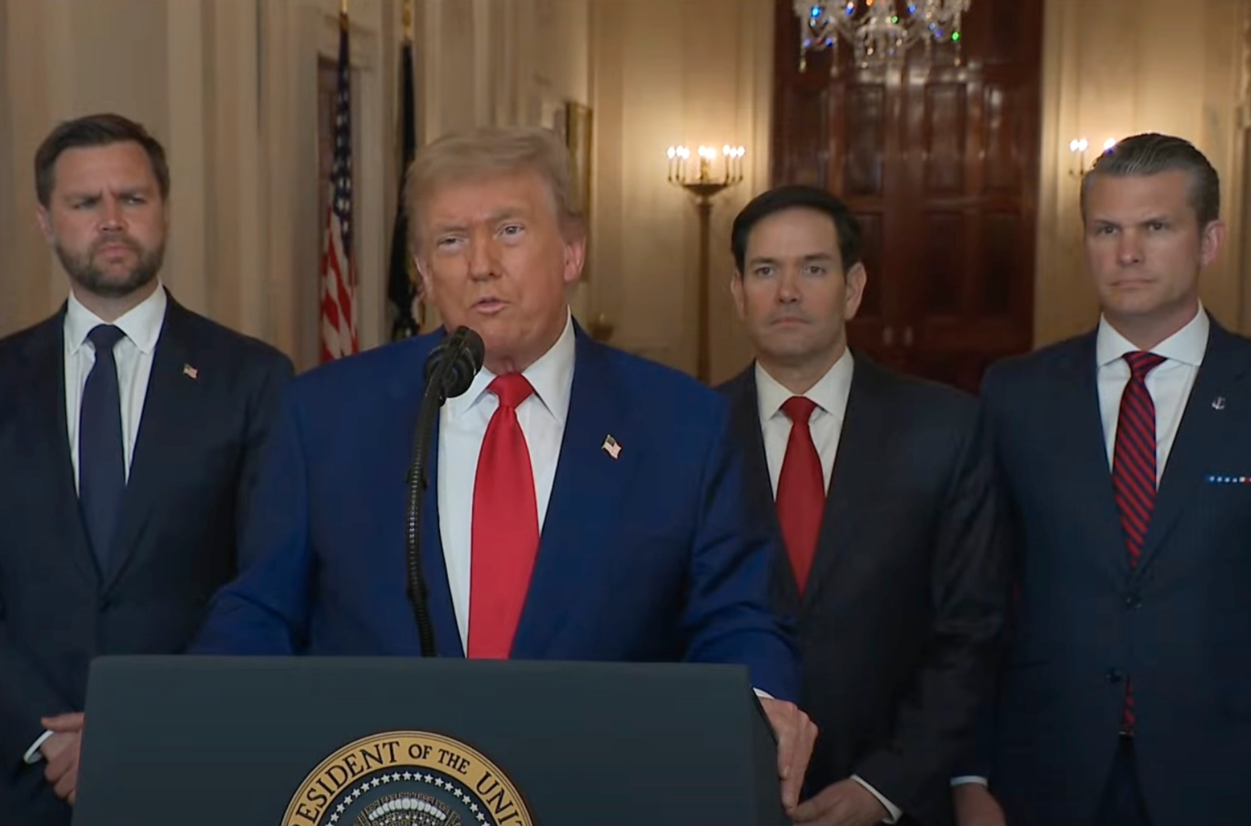 Сегодня я могу сообщить миру, что удары стали впечатляющим военным успехом. Ключевые ядерные объекты Ирана по обогащению урана были полностью и окончательно уничтожены. Иран, хулиган Ближнего Востока, должен теперь заключить мир. Если они этого не сделают, последующие атаки будут гораздо масштабнее и намного проще. <...>