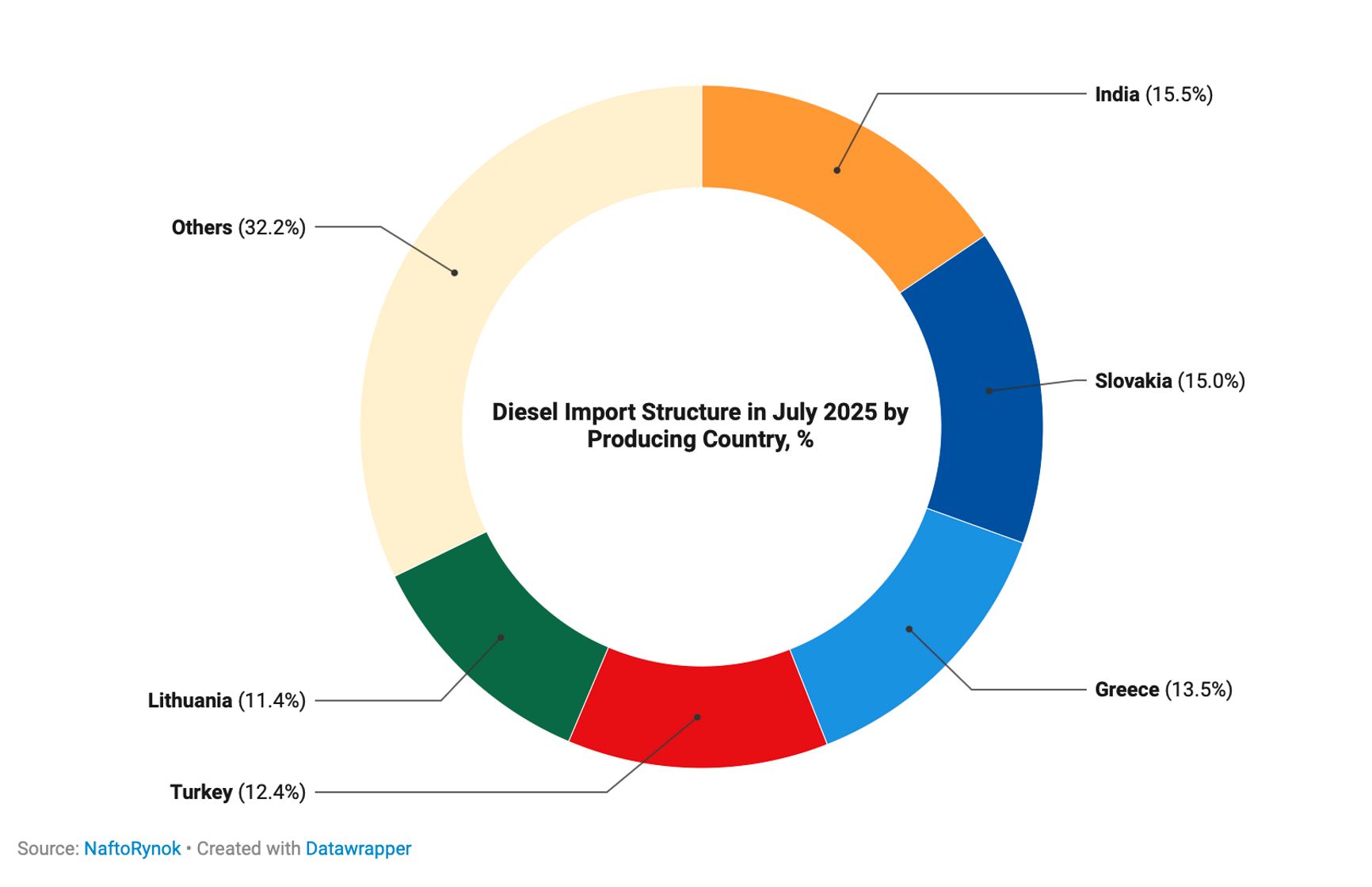 Топливо индийского производства в основном ввозилось в Украину танкерами из Румынии, по Дунаю. Еще 15% украинского импорта дизельного топлива поставила Словакия, далее следуют Греция, Турция, Литва, Польша, Швеция, США, Дания, Саудовская Аравиия и другие.