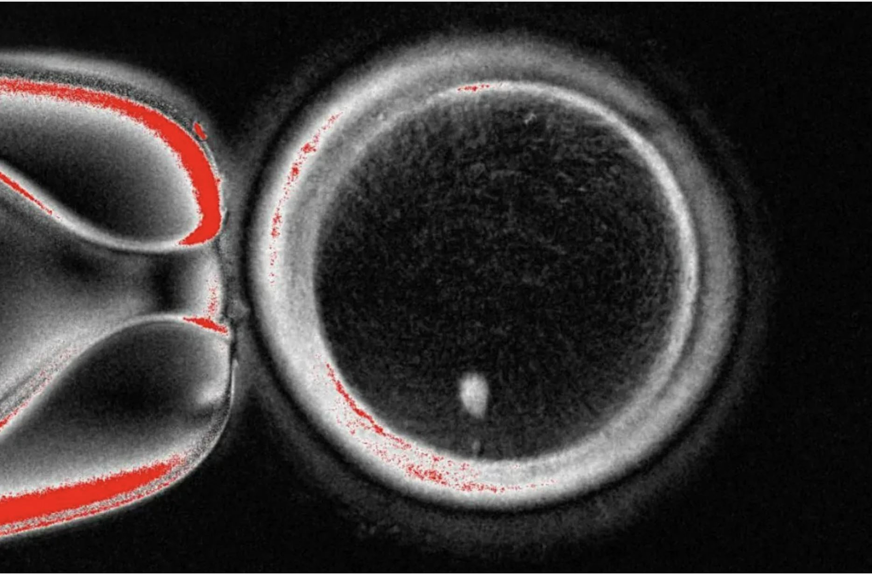 Большой круг — яйцеклетка под микроскопом, белая точка внизу — генетический материал, взятый из клетки кожи и помещенный внутрь