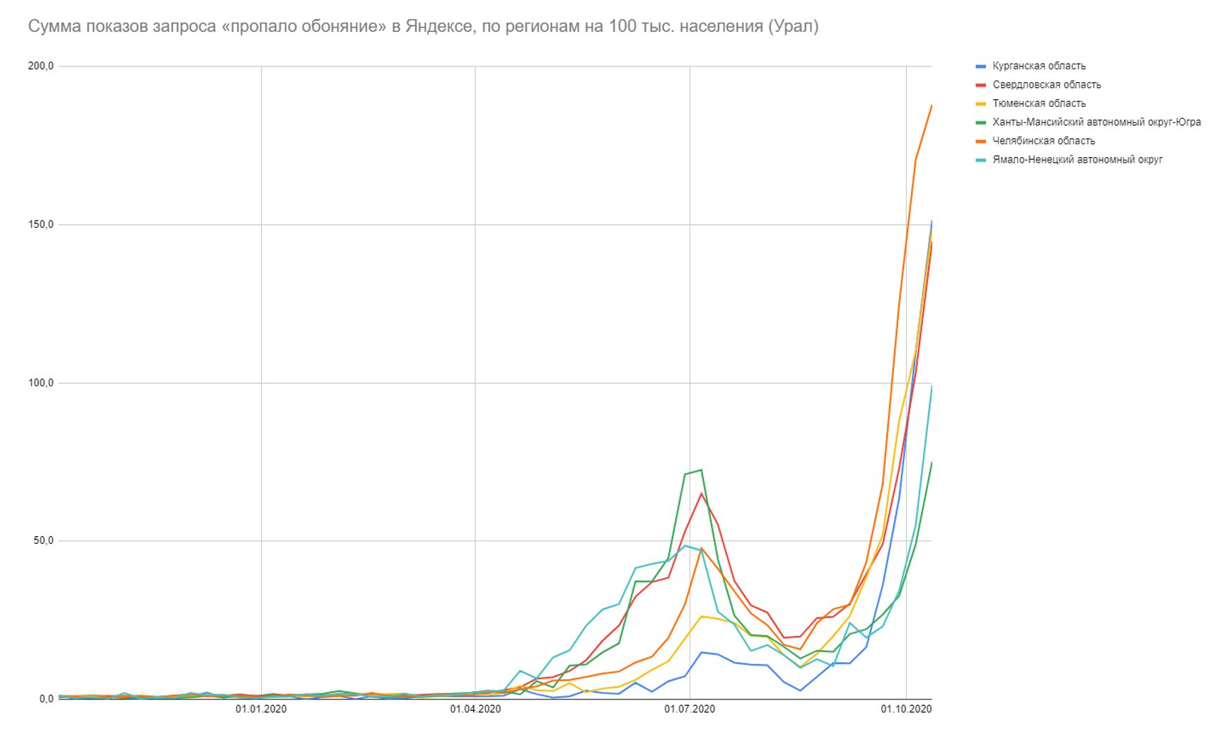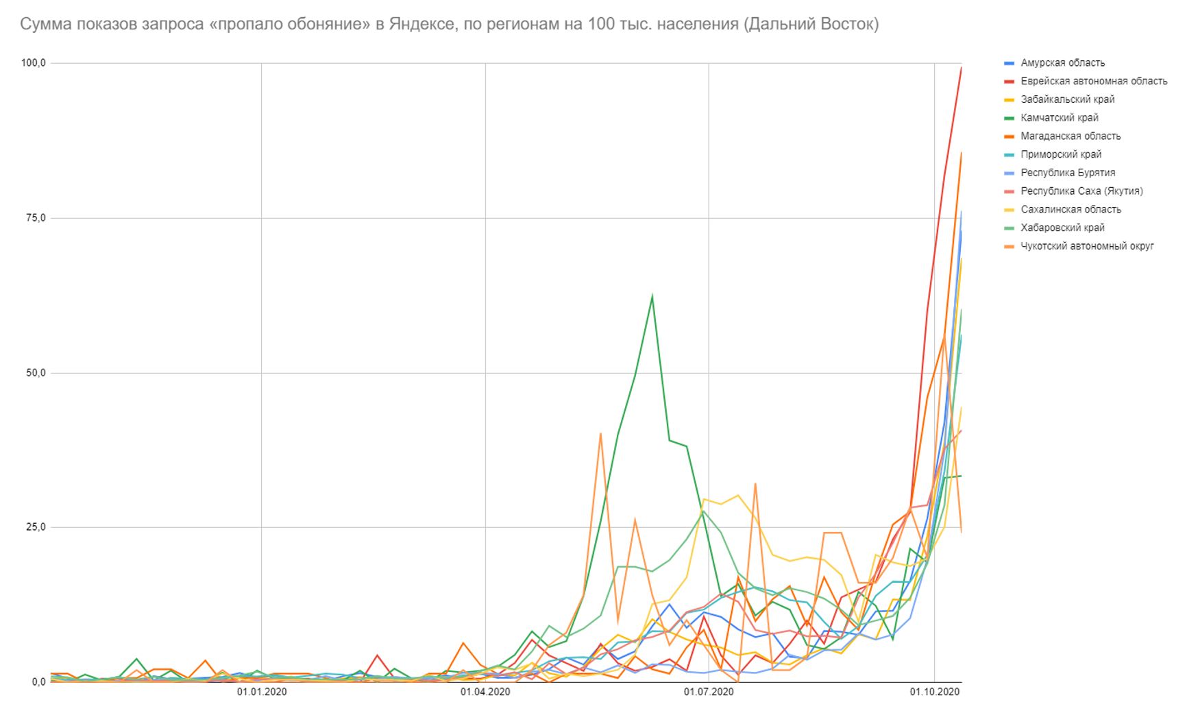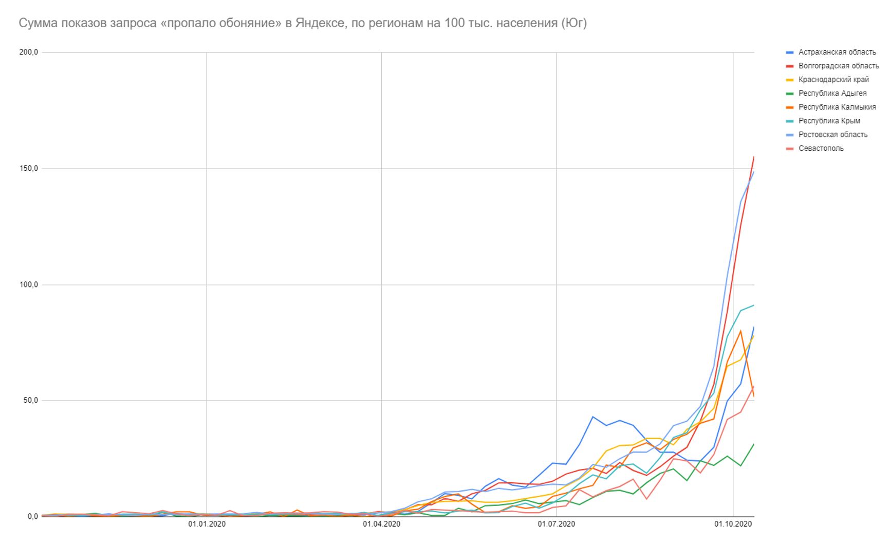 Если оценивать относительную долю показов (сколько % приходилось на конкретный запрос от всех запросов в Яндексе в регионе за период), картина ещё страшнее — в 6 регионах ситуация вдвое хуже, чем в Москве на майском пике, ещё в 3 — ситуациях втрое хуже, остальные регионы уже преодолели весенне-летние пики — и свои, и московский: