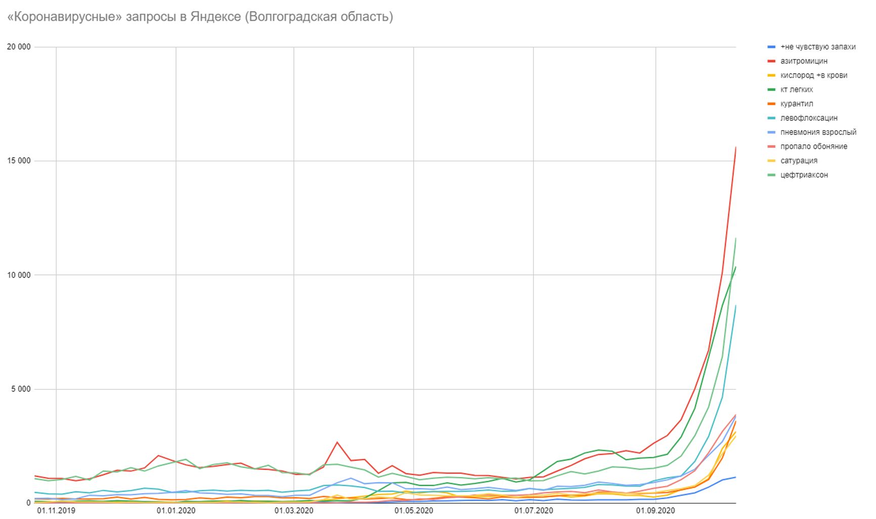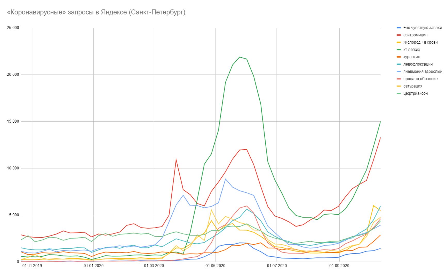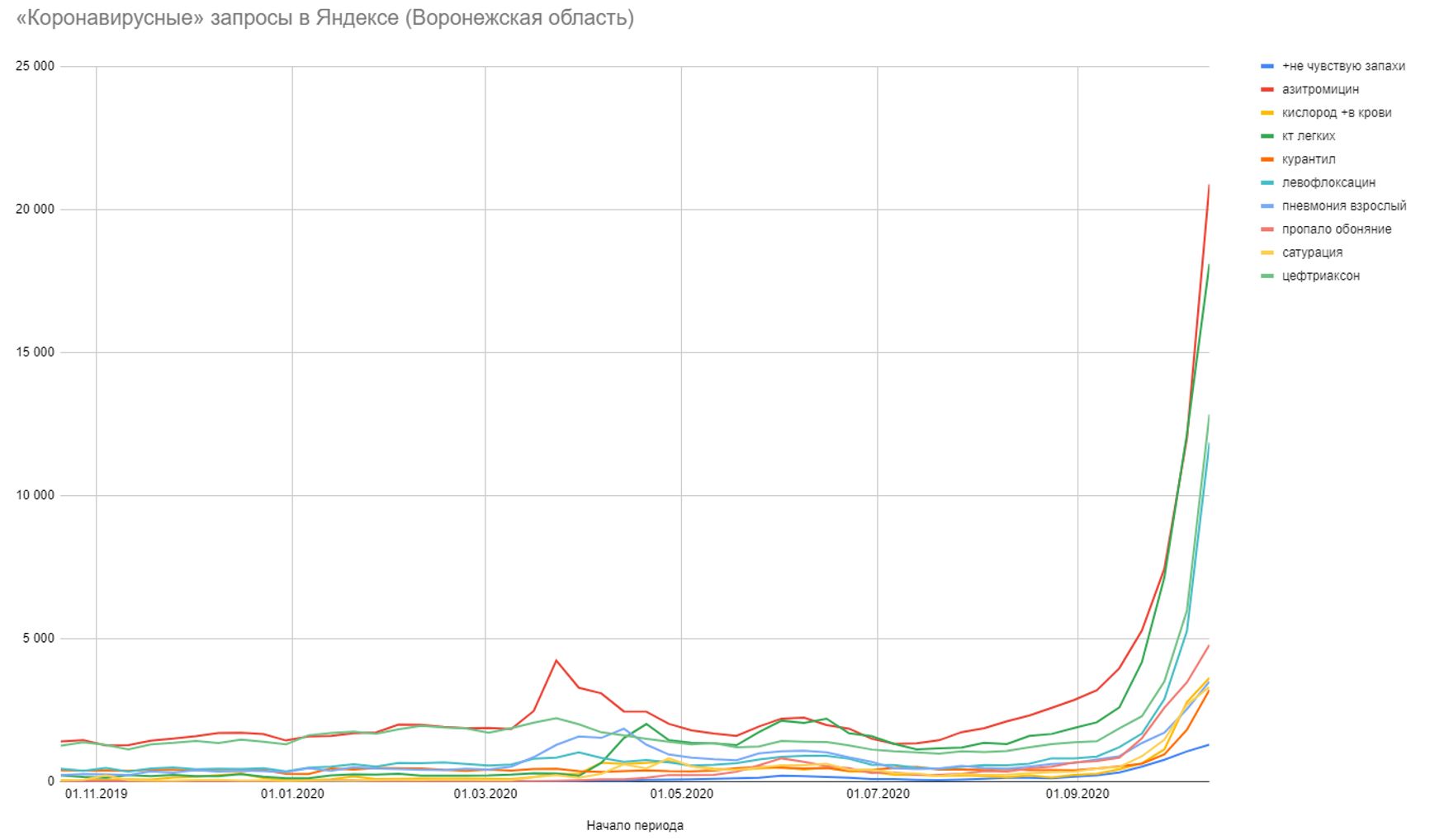 Он прост и доступен каждому. У Яндекса есть Вордстат — инструмент, который позволяет смотреть помесячную или понедельную динамику показов по нужным поисковым запросам. И есть особые «коронавирусные» запросы, которыми с большей вероятностью будут пользоваться заболевший человек и его близкие. Как правило, это запросы максимально практичные: связаны либо с самыми специфичными симптомами ковида (такими, как пропажа обоняния и вкусов), либо с конкретными лекарствами, либо с диагностикой. Подробнее про метод можно почитать здесь и здесь. Главная идея — есть запросы, которые наиболее точно коррелируют с реальной заболеваемостью.