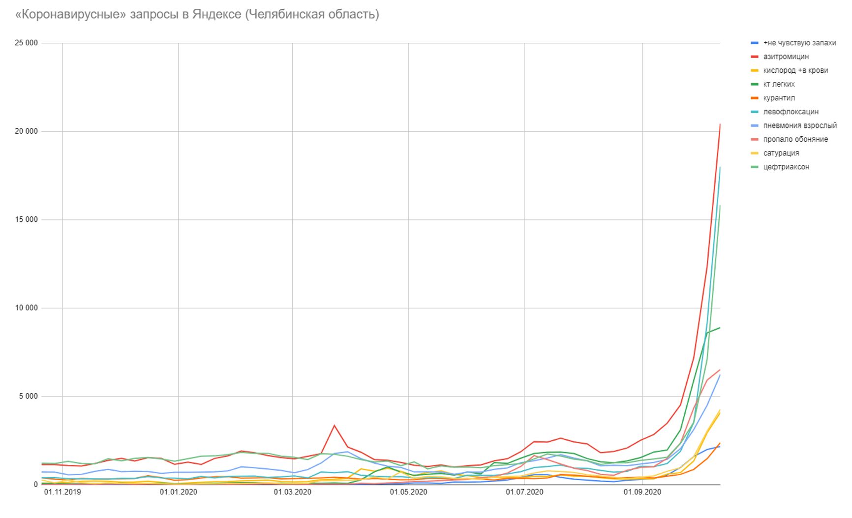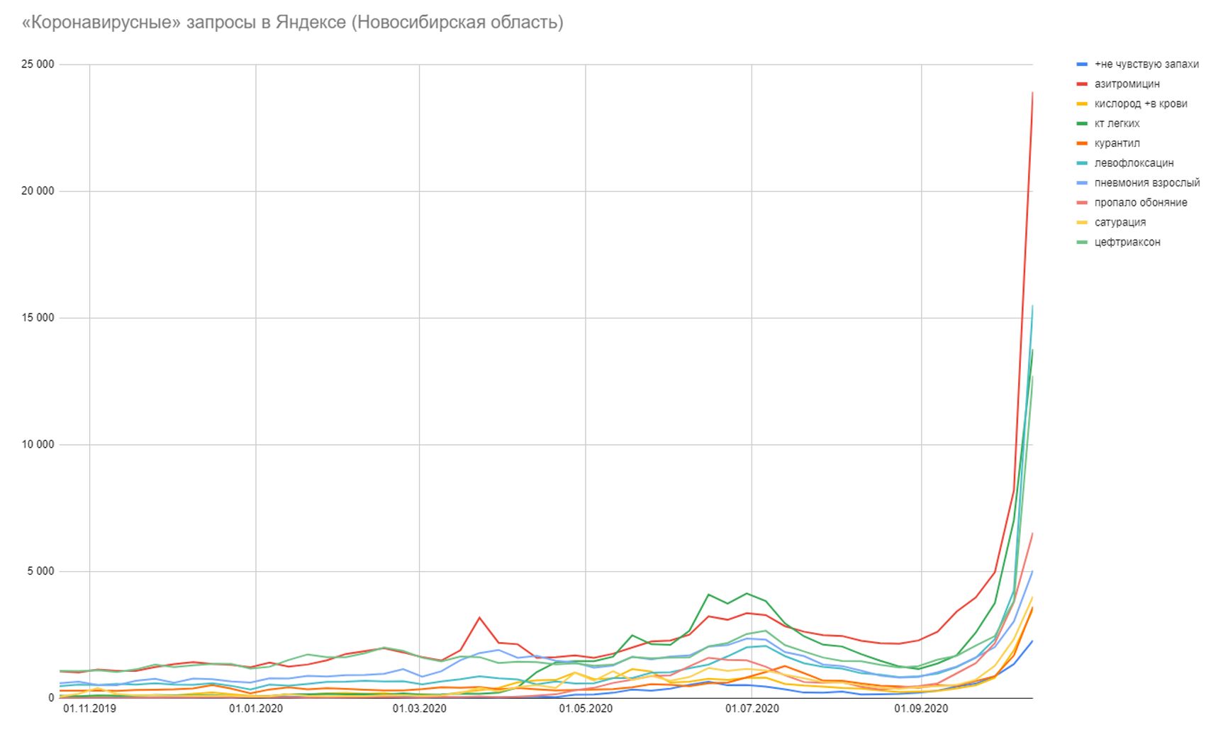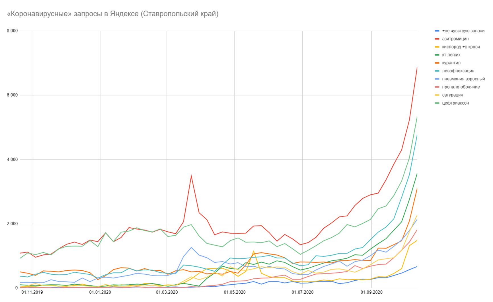 Он прост и доступен каждому. У Яндекса есть Вордстат — инструмент, который позволяет смотреть помесячную или понедельную динамику показов по нужным поисковым запросам. И есть особые «коронавирусные» запросы, которыми с большей вероятностью будут пользоваться заболевший человек и его близкие. Как правило, это запросы максимально практичные: связаны либо с самыми специфичными симптомами ковида (такими, как пропажа обоняния и вкусов), либо с конкретными лекарствами, либо с диагностикой. Подробнее про метод можно почитать здесь и здесь. Главная идея — есть запросы, которые наиболее точно коррелируют с реальной заболеваемостью.