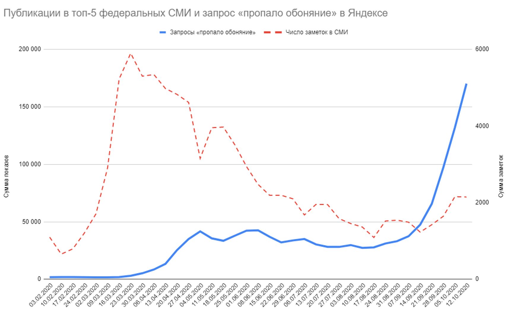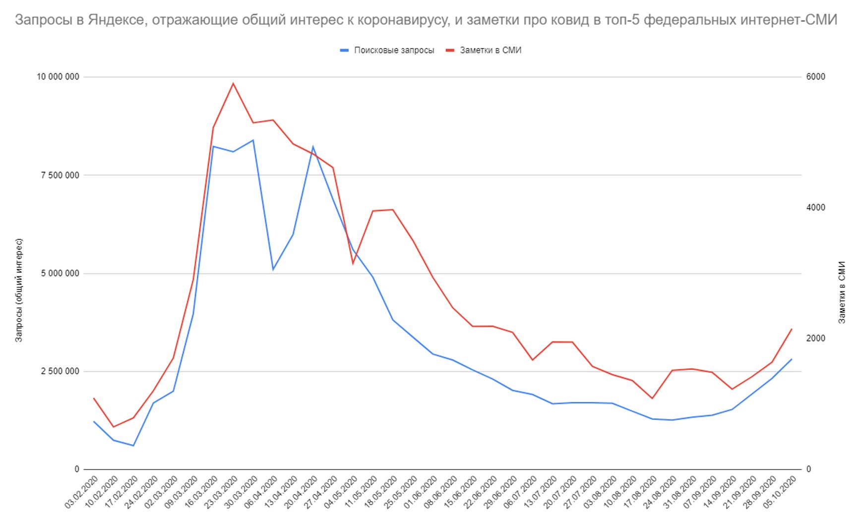 Пик интереса приходится на вторую половину марта — именно тогда коронавирус становится главной федеральной повесткой, создаётся специальная рабочая группа Госсовета, Путин посещает Коммунарку и впервые обращается к россиянам. Далее объявляется «нерабочий месяц», Россия уходит на карантин, СМИ публикуют тысячи заметок про коронавирус — а с окончанием «нерабочих дней» резко теряют к нему интерес.