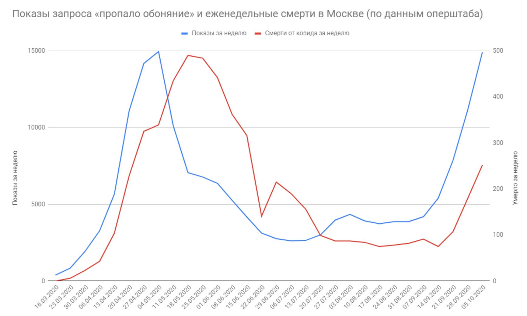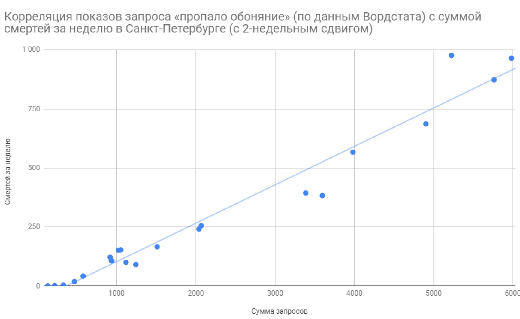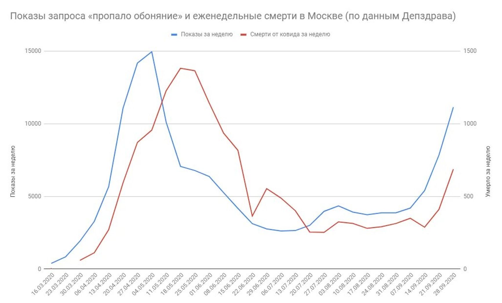 «Пропало обоняние» — запрос не медийный: его популярность не зависит от активности СМИ, и он растёт непрерывно на протяжении 2 месяцев — тогда как медийные запросы дают разовый пик, который за одну-две недели спадает. Кроме него, растут и другие специфические запросы, и коэффициент корреляции этих запросов с «пропало обоняние» — от 0,9 до 0,995. И у всех — общий тренд.