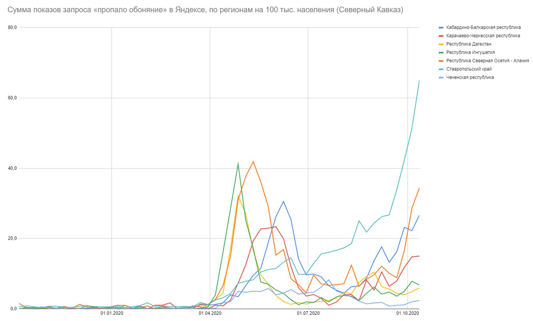 И такая картина повсеместна. За резким ростом специфичных «ковидных» запросов следует прирост смертности, и его пик происходит, как правило, спустя 2−3 недели от пика запросов. Это соответствует реальному течению болезни: пропажа обоняния — часто один из ранних симптомов, а между заражением и смертью в среднем проходит 20−25 дней (что соответствует 2−3 неделям от первых симптомов до смерти). Исключение — северокавказские республики, где регистрация смертей происходила с сильным лагом (от 1 до 3 месяцев, в зависимости от региона), что связано, по всей видимости с местными особенностями учёта. Например, в Северной Осетии избыточная смертность в мае +43,6%, в июне резкое падение до −28,1%, в июле вновь резкий подъём до +54,5% — это в большей мере статистические аномалии, чем отражение реальной ситуации.