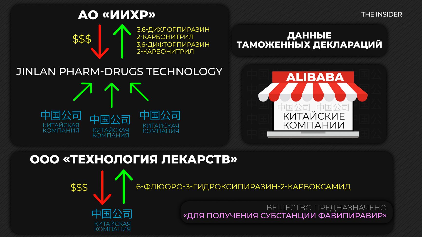 В распоряжении редакции имеются номера деклараций на ввоз вещества. Так, 2 и 6 апреля, а затем 11 мая и 18 июня на производство компании «ХимРар» в Химках от китайского поставщика приехали почти 90 кг веществ, из которых за несколько операций можно получить фавипиравир. Задекларированная стоимость интермедиатов — всего 23 млн рублей, ничтожная сумма по сравнению с миллиардными бюджетами госзакупок. По оценке китайского продавца, компании Jinlan Pharm-Drugs Technology Co., из такого количества можно изготовить десятки тысяч таблеток — с ним корреспондент The Insider общался на маркетплейсе Alibaba, где в 2020 году был представлен магазин компании, и в нем можно было купить субстанцию фавипиравира. В 2021 году купить эту субстанцию на Alibaba уже невозможно — по требованию лицензиата такие товары были заблокированы. Однако на сайте поставщика ссылка на товар все еще имеется.