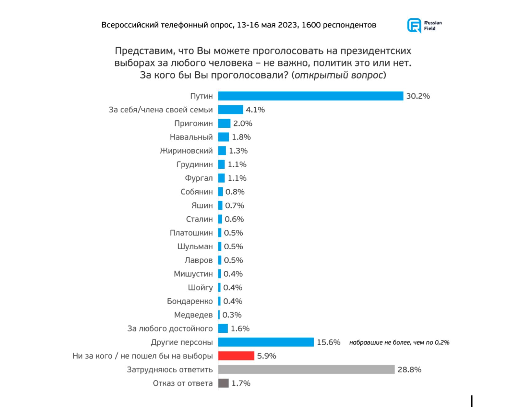 В мае 2023 года независимая социологическая группа Russian Field провела телефонный опрос, где среди прочего узнала о желаемом кандидате на должность следующего президента России. Опрос был открытый, то есть каждый мог назвать любую кандидатуру, пришедшую ему в голову. Как всегда, преобладающее число россиян отказались отвечать, а среди ответивших первое место, как всегда занял Путин. Но вот на второе место впервые за всю историю наблюдений вышел Евгений Пригожин. Руководитель медиаблока Russian Field и социолог Дарья Павлова в беседе с The Insider рассказала, что эти результаты их удивили: