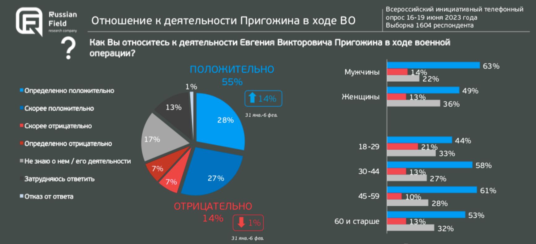 Непосредственно перед началом мятежа (16–19 июня) Russian Field в очередной раз измерила отношение россиян к «специальной военной операции» и к ведущим российским политикам, включив в опрос Евгения Пригожина. Как всегда, 9 из 10 отказались отвечать, но из ответивших почти половина опрошенных сказали, что одобряют его деятельность. Поддержка Пригожина преобладала во всех половозрастных группах и среди людей с разными источниками информации (телевидение, интернет-СМИ и Telegram-каналы). При этом основной, «ядерный электорат» владельца ЧВК Вагнера — возрастные мужчины старше 45 лет, поддерживающие войну и считающие успешным ход ее проведения. Мнения тех, кто считает военную операцию в целом неуспешной или предпочел бы ее отменить, разделились. И всё же по итогам этого опроса поддержка деятельности Пригожина выросла по сравнению с февралем с 41 до 55% — из тех, кто отвечает на опросы социологов.