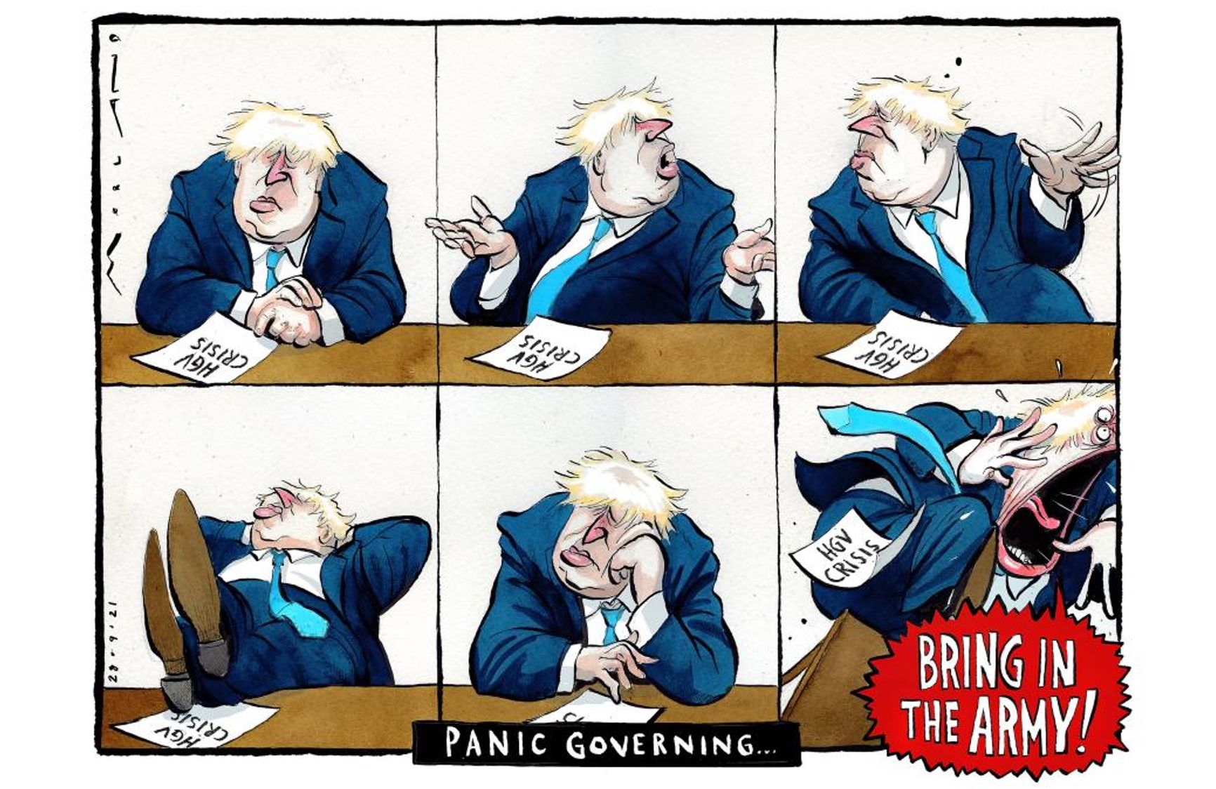 Как и должно быть в нормальной демократической стране, британские газеты полны карикатур, авторы которых смеются над нелепыми ошибками правительства. И бульварные издания этим занимаются, и самые серьезные и солидные тоже. Evening Standard изобразил еще более взъерошенного, чем в жизни Бориса Джонсона с «пистолетом» опустошенной бензозаправки в руке. И добавил подпись к карикатуре, обыгрывающую название нового фильма Бондианы: «No time to drive», «Не время ездить». The Times представила премьера в шести кадрах: на пяти из них он изо всех сил демонстрирует презрение к тем, «кто поддается панике» по поводу нехватки водителей грузовиков. В одном из них он даже на стол ноги закидывает, на другом – демонстративно дремлет. В общем, показывает, как он расслаблен и уверен в том, что ситуация под контролем. А вот на шестом кадре вдруг вскакивает так резко, что даже опрокидывает стол, истошно вопя при этом: «Вызывайте армию!».