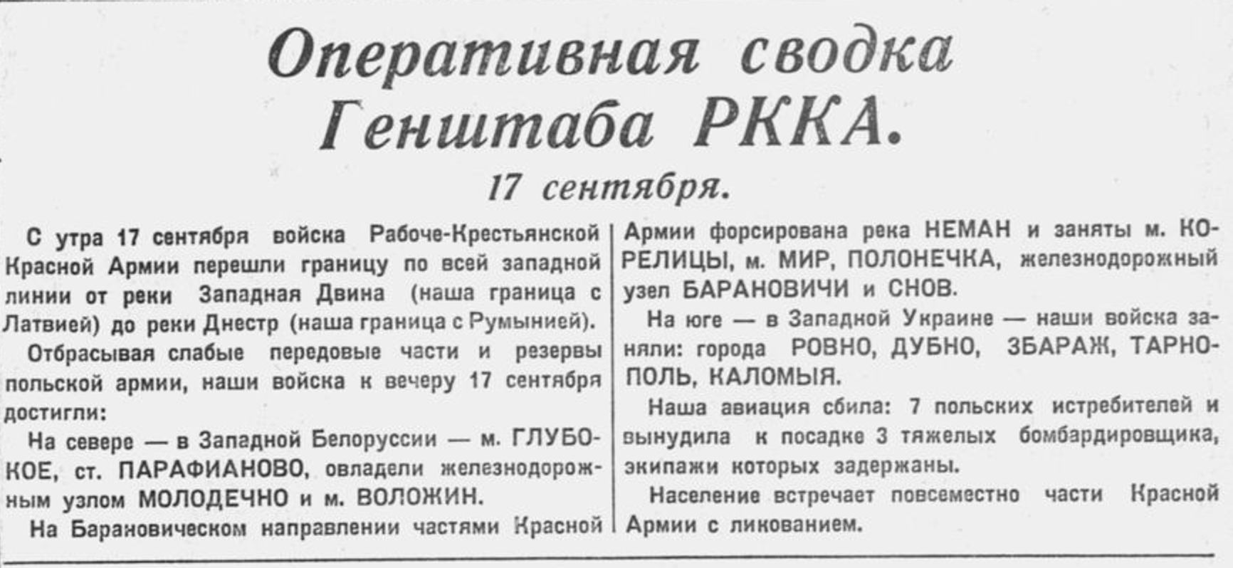«Советская власть считает себя обязанной, с целью охраны своих собственных интересов и защиты белорусского и украинского меньшинств в Восточной Польше, отдать приказ своим войскам в воскресенье, в шесть утра по московскому времени (четыре утра по центральноевропейскому времени), перейти советско-польскую границу».