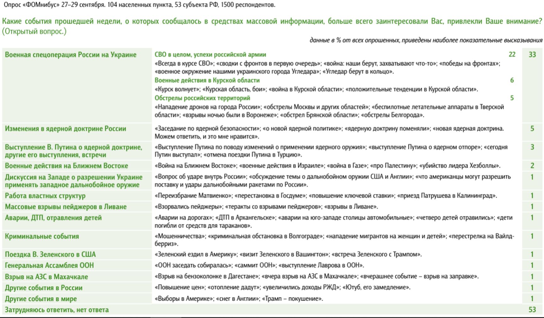 У «Левады» в рейтинге событий августа Курск на первом месте с 40%, а «СВО» (война, Украина) в целом — 12%. Данные за сентябрь еще не опубликованы.