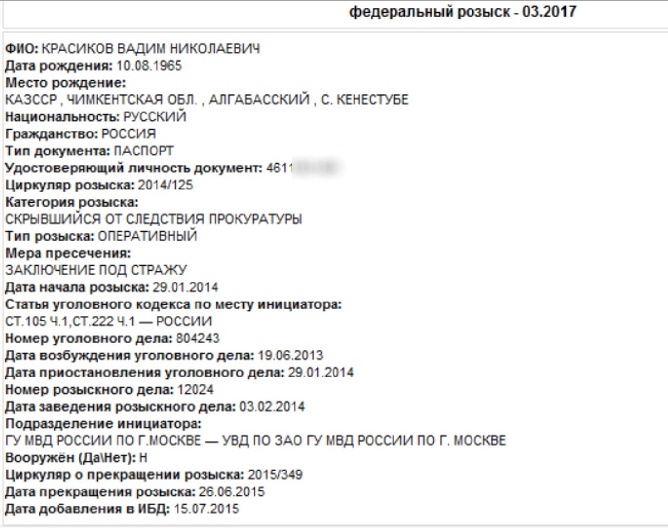 Вадим Красиков родился 10 августа 1965 года в селе Кенестобе в Туркестанской области Казахстана. В 80-е его семья переехала в Бурятию. Там Красиков женился и вместе с женой и двумя детьми переехал в Иркутск. В Москву он переехал в 2019 году, но, возможно, еще до московского убийства уже совершал преступления. Во всяком случае известно, что правоохранительные органы Карелии интересовались им еще в 2007 году в связи одним из уголовных дел. Несколько источников с доступом к полицейским базам подтверждают, что сейчас Вадима Красикова не удается обнаружить в «Интегрированном банке данных» (ИБД) МВД, хотя в оффлайновой базе есть циркуляр розыска под номером 2014 125, где значатся дата прекращения розыска Красикова (26.06.2015) и дата добавления информации в ИБД (15.07.2015). Это значит, что кто-то постфактум стер информацию о Красикове в базе.