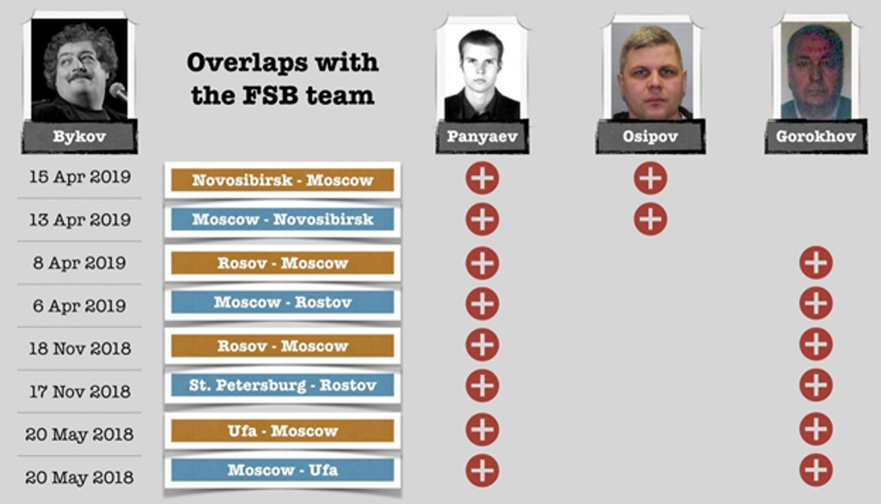 Как и в случае с Навальным и Кара-Мурзой, группа убийц из ФСБ включала химиков из «Лаборатории» (НИИ-2 ФСБ) и сотрудников Службы по защите конституционного строя (Вторая служба ФСБ). Следить за Быковым они начали как минимум за год до отравления. 20 мая 2018 года в 9:35 утра Быков вылетел из Москвы в Уфу, чтобы прочитать лекцию детям и их родителям о Карлсоне, который живет на крыше. Вместе с ним вылетели и бесстрашные офицеры Второй службы ФСБ (призванной бороться с наиболее опасными экстремистами и террористами) Владимир Паняев (летевший под своим именем) и Валерий Сухарев (летевший с паспортом на имя Николай Горохов). Вопреки устоявшейся практике, в тот раз они летели одним рейсом с Быковым (в дальнейшем они такого себе не позволяли и обратно полетели на следующий день разными рейсами — Быков вечером, а ФСБшники в полдень).