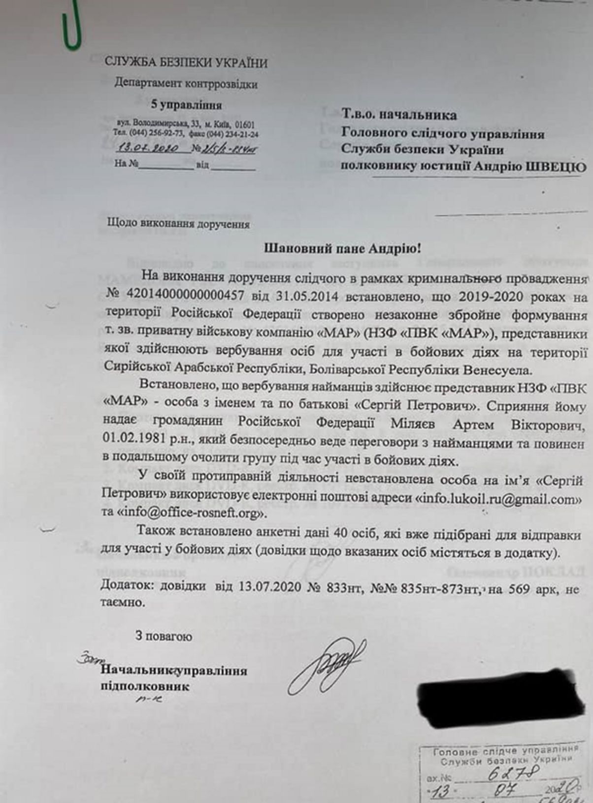 В апреле 2020 года «Сергей Петрович» снова связался с «Шаманом» и спросил, сколько человек из его группы, состоявшей из 120 наемников, можно нанять для проекта ЧВК «МАР». Миляев ответил, что ему нужно перепроверить и позвонить каждому из них, поскольку «слишком много времени прошло» и «наверняка половина уже у „музыкантов“».