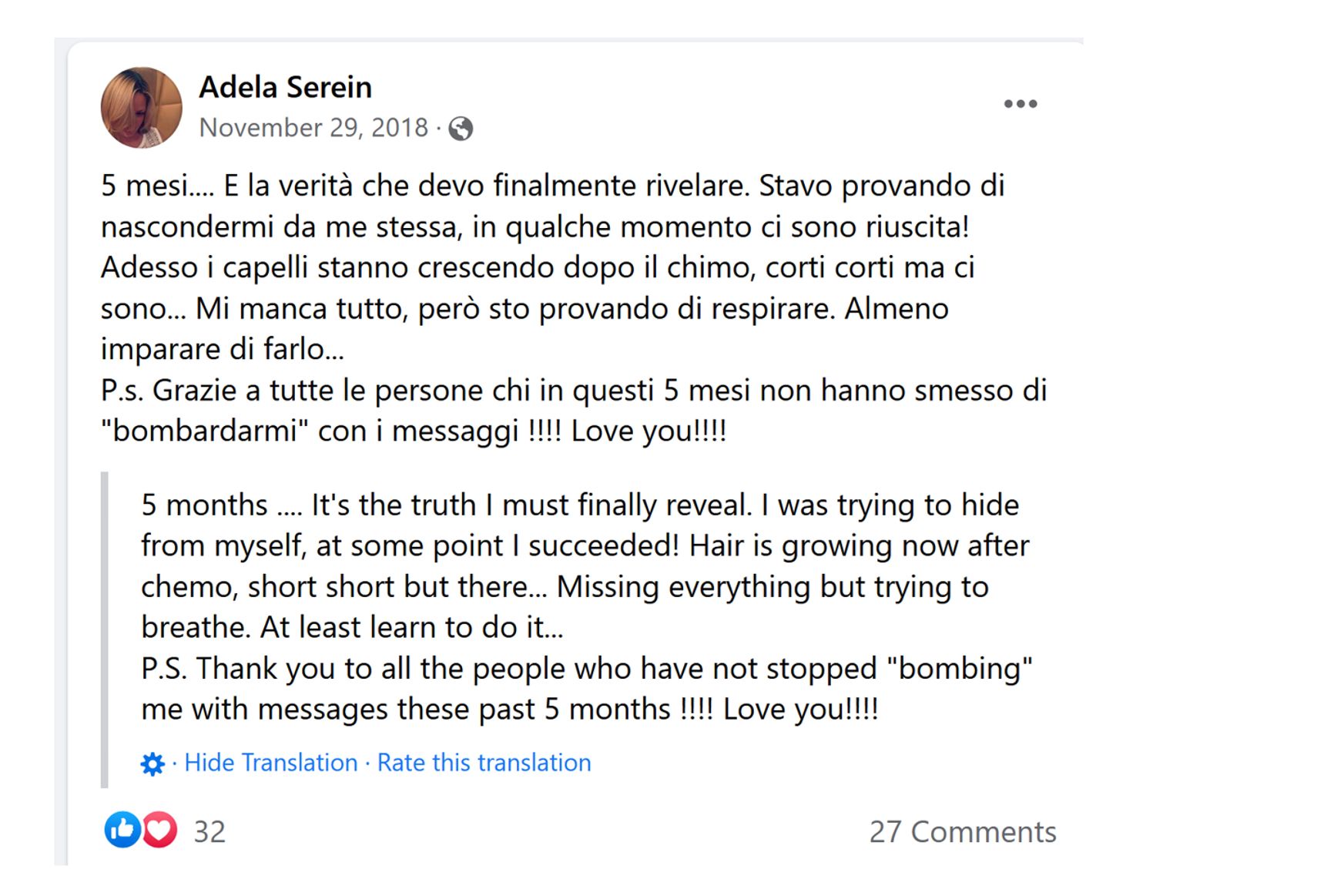 После публикации The Insider и Bellingcat расследования о «Петрове» и «Боширове» с упоминанием ГРУшной серии паспортов «Мария Адела» в последний раз прилетела в Москву, ничего не успев объяснить своим европейским знакомым. Единственным сувениром из ее прошлой жизни, который «Мария Адела» захватила с собой, была кошка Луиза, которую ее знакомые описали как «единственную стабильную вещь в ее жизни». Через два месяца после отъезда она опубликовала последний загадочный, но важный пост на своей странице в Facebook. В нем она упомянула, что страдала от рака, и рассказала о том, что ее волосы снова отросли «после химиотерапии».